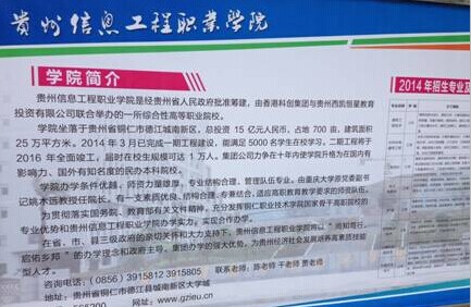 貴州信息工程職業(yè)學(xué)院是經(jīng)貴州省人民政府批準(zhǔn)籌建,由香港科創(chuàng)集團(tuán)與貴州西凱恒星教育投資有限公司聯(lián)合舉辦的一所民營(yíng)綜合性高等職業(yè)院校。學(xué)院坐落于貴州省銅仁市德江縣城南新區(qū),計(jì)劃總投資15億元人民幣,規(guī)劃占地700畝,建筑面積25萬(wàn)平方米。今年3月底前完成一期工程建設(shè),達(dá)到國(guó)家正式設(shè)立標(biāo)準(zhǔn),可投入使用;二期工程于2016年全面竣工,屆時(shí)在校生規(guī)?蛇_(dá)10000人。力爭(zhēng)在十年內(nèi)使學(xué)院升格為在國(guó)內(nèi)有影響力、國(guó)外有知名度的民營(yíng)本科院校。