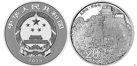 中國(guó)人民銀行定于2015年4月28日發(fā)行中國(guó)佛教圣地(九華山)金銀紀(jì)念幣一套。該套紀(jì)念幣共5枚,其中金幣3枚,銀幣2枚,均為中華人民共和國(guó)法定貨幣。該套金銀紀(jì)念幣正面圖案均為中華人民共和國(guó)國(guó)徽,并刊國(guó)名、年號(hào)。62.208克(2盎司)圓形銀質(zhì)紀(jì)念幣背面圖案為“天臺(tái)寺”景觀造型,并刊“九華山•天臺(tái)寺”字樣及面額。該圓形銀質(zhì)紀(jì)念幣為精制幣,含純銀2盎司,直徑40毫米,面額20元,成色99.9%,最大發(fā)行量60000枚。該套金銀紀(jì)念幣由深圳國(guó)寶造幣有限公司鑄造,中國(guó)金幣總公司總經(jīng)銷。
