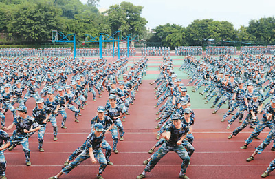 很多中學(xué)、大學(xué)新生通過(guò)軍訓(xùn),培養(yǎng)吃苦耐勞的作風(fēng)、嚴(yán)明的紀(jì)律觀念、團(tuán)結(jié)協(xié)作的精神,既鍛煉學(xué)生的身體素質(zhì),又磨煉了意志品格、增強(qiáng)了國(guó)防觀念。