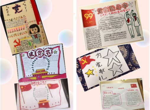 在這個(gè)特殊的日子里,同學(xué)們學(xué)習(xí)調(diào)研“七一”建黨節(jié)的來歷,網(wǎng)絡(luò)隊(duì)課講述了中國共產(chǎn)黨99年的奮斗歷程以及新時(shí)代黨的新任務(wù)新使命,班主任耿瑞軒老師勉勵(lì)同學(xué)們繼承光榮傳統(tǒng),勤奮學(xué)習(xí),初心向黨,愛國愛人民,做中國特色社會(huì)主義事業(yè)接班人。聽了中國共產(chǎn)黨的光榮歷史,孩子們被深深的感動(dòng)著,他們用手中的畫筆,畫出一幅幅生動(dòng)的手抄報(bào),圖文結(jié)合畫黨史。