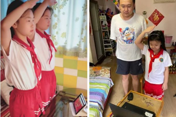 隨著兩位小主持人的出場,“用愛陪伴 攜手未來”2019—2020學年度第二學期結業(yè)式正式開始。線上和線下的老師、學生和家長一同參加了升旗儀式,莊嚴嘹亮的國歌響徹云端 。