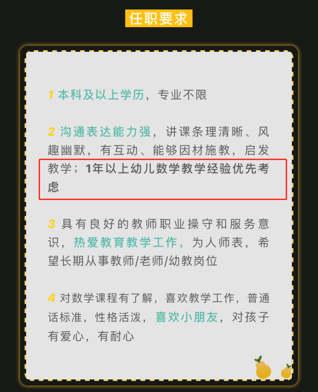 豌豆思維的老師招聘一共需要經(jīng)歷3輪面試+5次試講,一共8重關(guān)卡。對(duì)于老師的要求除了本科及以上學(xué)歷以外,還需要有1年以上的幼兒數(shù)學(xué)教學(xué)經(jīng)驗(yàn)。此外,對(duì)于候選老師的講課條理性、清晰程度,也做了硬性要求。