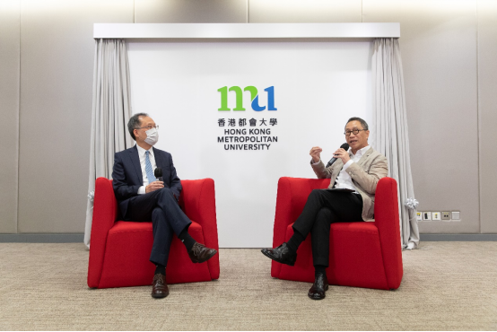 公大校長(zhǎng)林群聲教授(左)與陳幼堅(jiān)設(shè)計(jì)公司始創(chuàng)人兼創(chuàng)意總監(jiān)陳幼堅(jiān)(右)介紹校徽設(shè)計(jì)背后的理念。