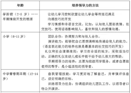 對于孩子來說,領(lǐng)導力的培養(yǎng)旨在讓孩子學會自我管理以及能夠盡早熟悉和調(diào)動周圍環(huán)境資源,學會與人溝通協(xié)作。在構(gòu)建自我價值觀的基礎(chǔ)之上,嘗試帶動環(huán)境成長。從小培養(yǎng)孩子的領(lǐng)導力,是要在孩子成長的關(guān)鍵時期注入這樣的意識。美國心理學家蘇珊·墨菲和斯丹芬尼·約翰遜認為,在孩子2歲起就可以著手培養(yǎng)孩子的領(lǐng)導力,在不同的階段調(diào)整培養(yǎng)方式。