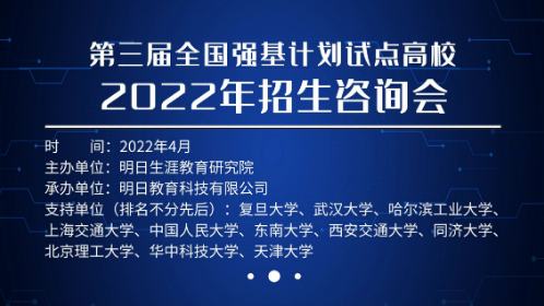 為落實《教育部關(guān)于在部分高校開展基礎(chǔ)學(xué)科招生改革試點工作的意見》精神,服務(wù)國家重大戰(zhàn)略需求,加強基礎(chǔ)學(xué)科拔尖創(chuàng)新人才選拔培養(yǎng),探索多維度考核評價模式,助力實現(xiàn)為國家重大戰(zhàn)略領(lǐng)域輸送后備人才的目標,近日,明日生涯教育研究院舉辦了“第三屆全國強基計劃試點高校2022年招生咨詢會”。