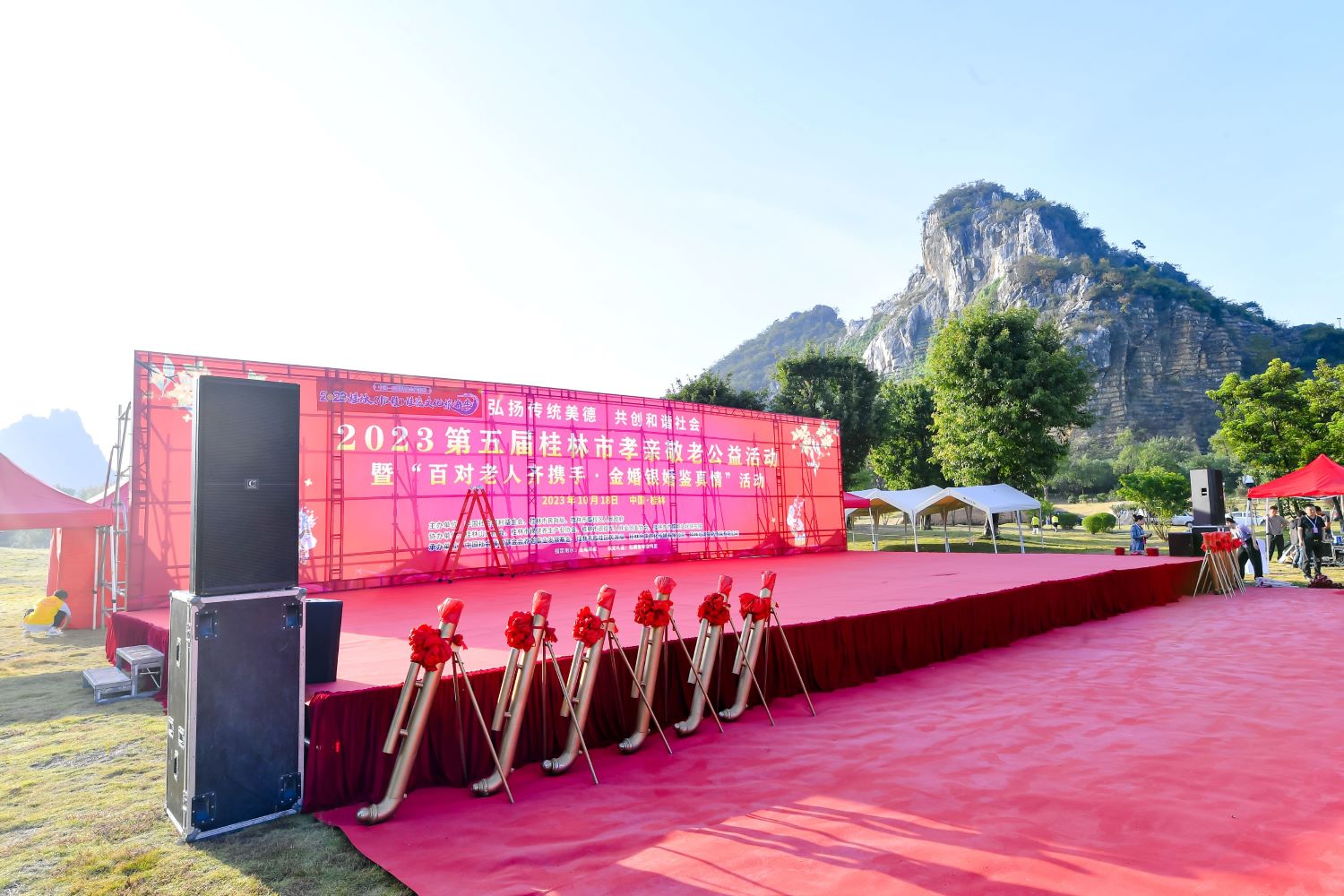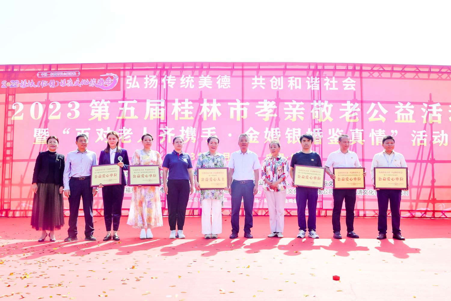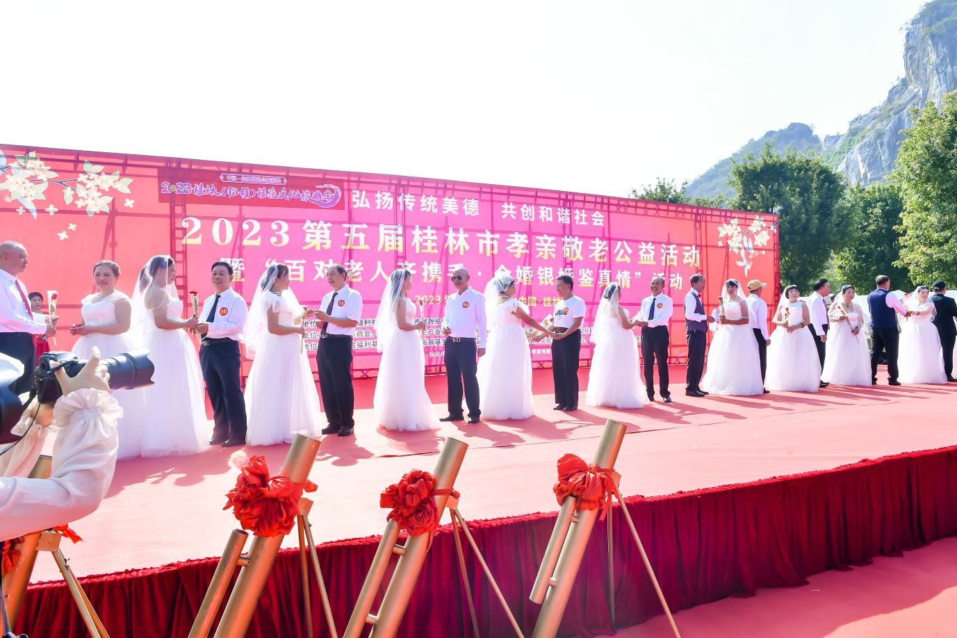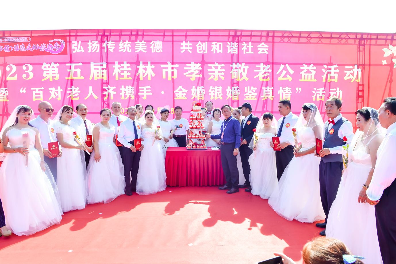 金秋送爽,桂花飄香,孝親敬老,情深誼長。在喜迎2023年九九重陽節(jié)暨我國法定第11個老年節(jié)到來之際,由中國社會福利基金會主辦,中國社會福利基金會養(yǎng)老事業(yè)發(fā)展基金承辦的“百對金婚銀婚·鑒真情”孝親敬老系列公益活動,在桂林市民政局、臨桂區(qū)人民政府及臨桂區(qū)民政局等單位的大力支持以及愛心企業(yè)和公益志愿者的積極參與下,隆重舉行。