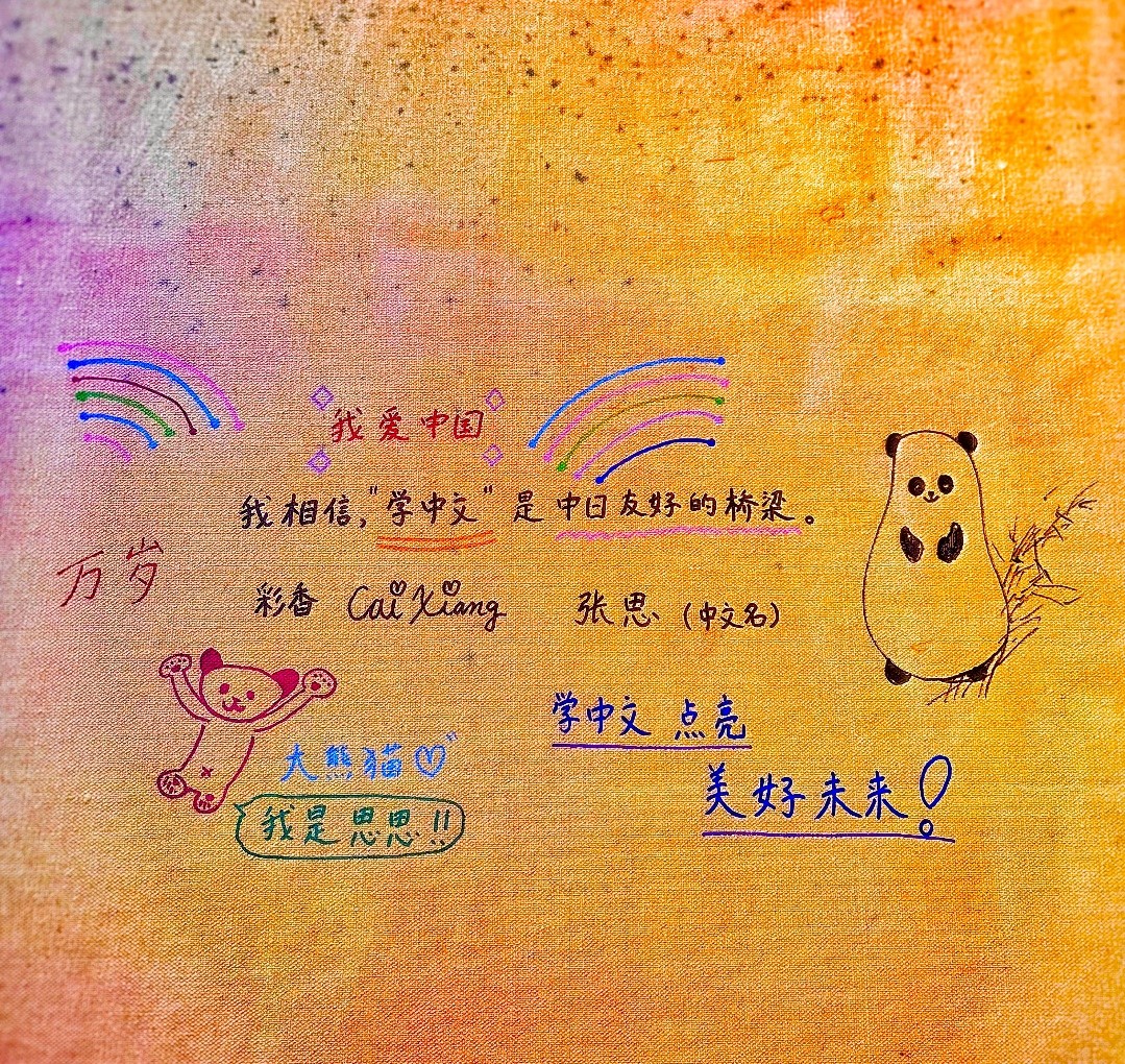 日本00后觀眾彩香Cai Xiang(中文名張思)以新一代青年人視角繪制了中國的熊貓以及象征和平的彩虹,用純真質(zhì)樸的筆觸書寫下了“我愛中國”和“我相信‘學(xué)中文’是中日友好的橋梁”的真誠寄語,表達(dá)了對中國的熱愛和中日友好的美好心愿。宮城順子等觀眾用中文書寫:“美麗的會(huì)帶來和平”“為中日友好添磚加瓦”等和平愿景,讓友好祝愿跨越山海,在藝術(shù)共鳴中生生不息。燦爛的畫面與真摯的留言,交織構(gòu)成了一幅象征光明與友愛的美麗畫卷,也成為本屆展覽中最具人文溫度的場域之一。