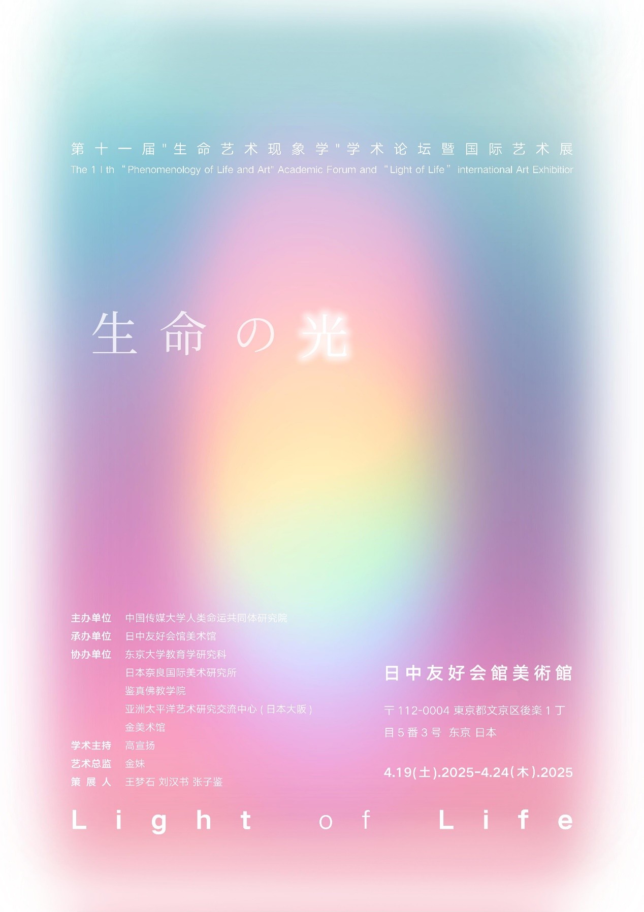 本次展覽由上海交通大學(xué)資深教授高宣揚(yáng)先生擔(dān)任學(xué)術(shù)主持,中國傳媒大學(xué)博士生導(dǎo)師金妹教授擔(dān)任藝術(shù)總監(jiān),東京大學(xué)教育學(xué)研究科特任助理教授王夢石、首都師范大學(xué)博士生劉漢書和張子鑒共同策展。展覽匯聚中日兩國28位藝術(shù)家,展出涵蓋坦培拉、中國畫、油畫、綜合繪畫及潮流藝術(shù)等60余件作品,展現(xiàn)出跨文化、跨媒介的藝術(shù)維度。自2006年起,由高宣揚(yáng)教授與金妹教授在北京聯(lián)袂發(fā)起了“頤和園國際藝術(shù)創(chuàng)作基地”暨“生命藝術(shù)創(chuàng)作共同體”,近20年先后在北京、巴黎、烏魯木齊、坦桑尼亞、泰國、美國、日本等多個(gè)國家和城市連續(xù)舉辦了十一屆藝術(shù)展暨學(xué)術(shù)論壇,對生命藝術(shù)現(xiàn)象學(xué)的理論研究和創(chuàng)作實(shí)踐產(chǎn)生了重要影響。藝術(shù)充滿于生活之中,貫穿于生命的一切歷程,反過來,生命的展現(xiàn)、延續(xù)和自我創(chuàng)造,不但離不開藝術(shù),而且,藝術(shù)本身簡直就是生命的赤裸裸的本質(zhì)表現(xiàn)。貫徹藝術(shù)家個(gè)人“獨(dú)立自主”和生命共同體“和諧共生”的雙重實(shí)踐,既發(fā)揮藝術(shù)家個(gè)人的創(chuàng)新潛能,又確保宇宙整個(gè)生命共同體持續(xù)系統(tǒng)地和諧運(yùn)行,朝向整體生命的“全息連接”和共同發(fā)展的理想境界發(fā)展,形成整個(gè)宇宙生命共同體與各個(gè)具體生命體之間的全面和諧關(guān)系網(wǎng)絡(luò),使藝術(shù)家個(gè)人和生命共同體邁向“求生”、“新生”、“恒生”的光明“生命之道”。