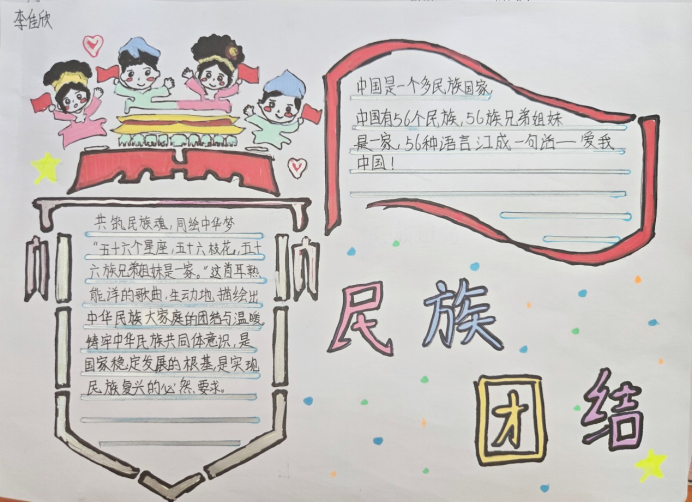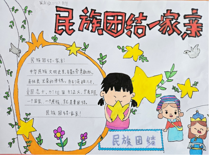 主題班會后,同學們充分發(fā)揮想象力與創(chuàng)造力,用繽紛的畫筆勾勒出民族團結的動人畫卷。作品中,各民族同胞攜手同行、共慶佳節(jié)的溫馨場景躍然紙上;不同民族特色文化相互交融、交相輝映的畫面生動呈現(xiàn)。一幅幅充滿童趣與溫情的繪畫作品,不僅展現(xiàn)了同學們的藝術才華,更表達了他們對民族團結的美好向往與堅定信念。