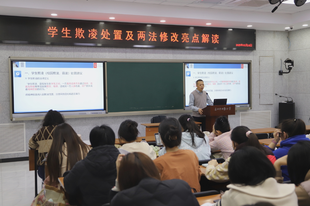 為進(jìn)一步提升全體教師的法律意識和應(yīng)對能力,東四十四條小學(xué)特別邀請北京市東衛(wèi)律師事務(wù)所合伙人、北東學(xué)區(qū)法律顧問、學(xué)校法治副校長王力律師,為全體教師帶來了一場關(guān)于《學(xué)生欺凌處置及兩法修改亮點解讀》的專題培訓(xùn)。此次培訓(xùn)是學(xué)校加強(qiáng)校園安全管理、提升教師專業(yè)素養(yǎng)的重要舉措,體現(xiàn)了學(xué)校對營造安全、健康校園環(huán)境的高度重視。