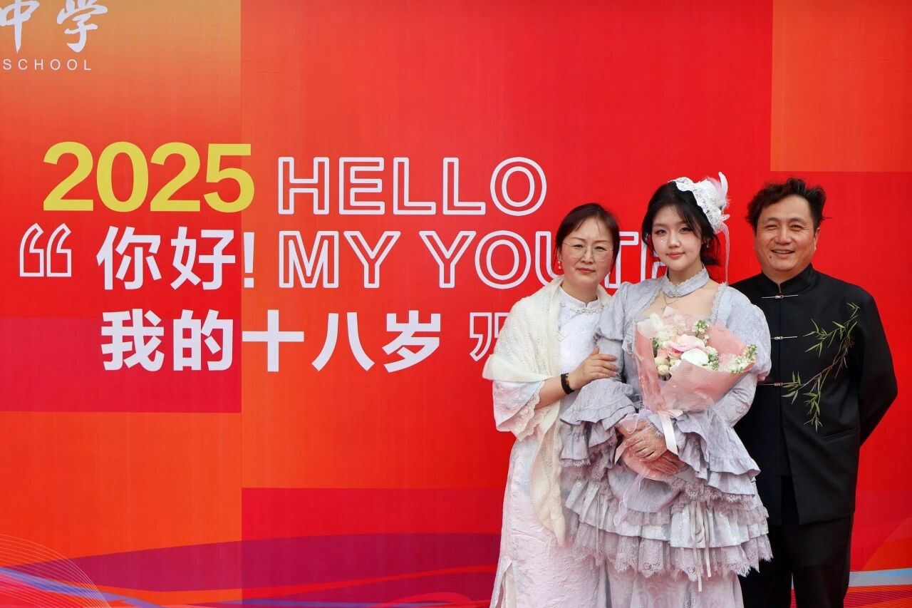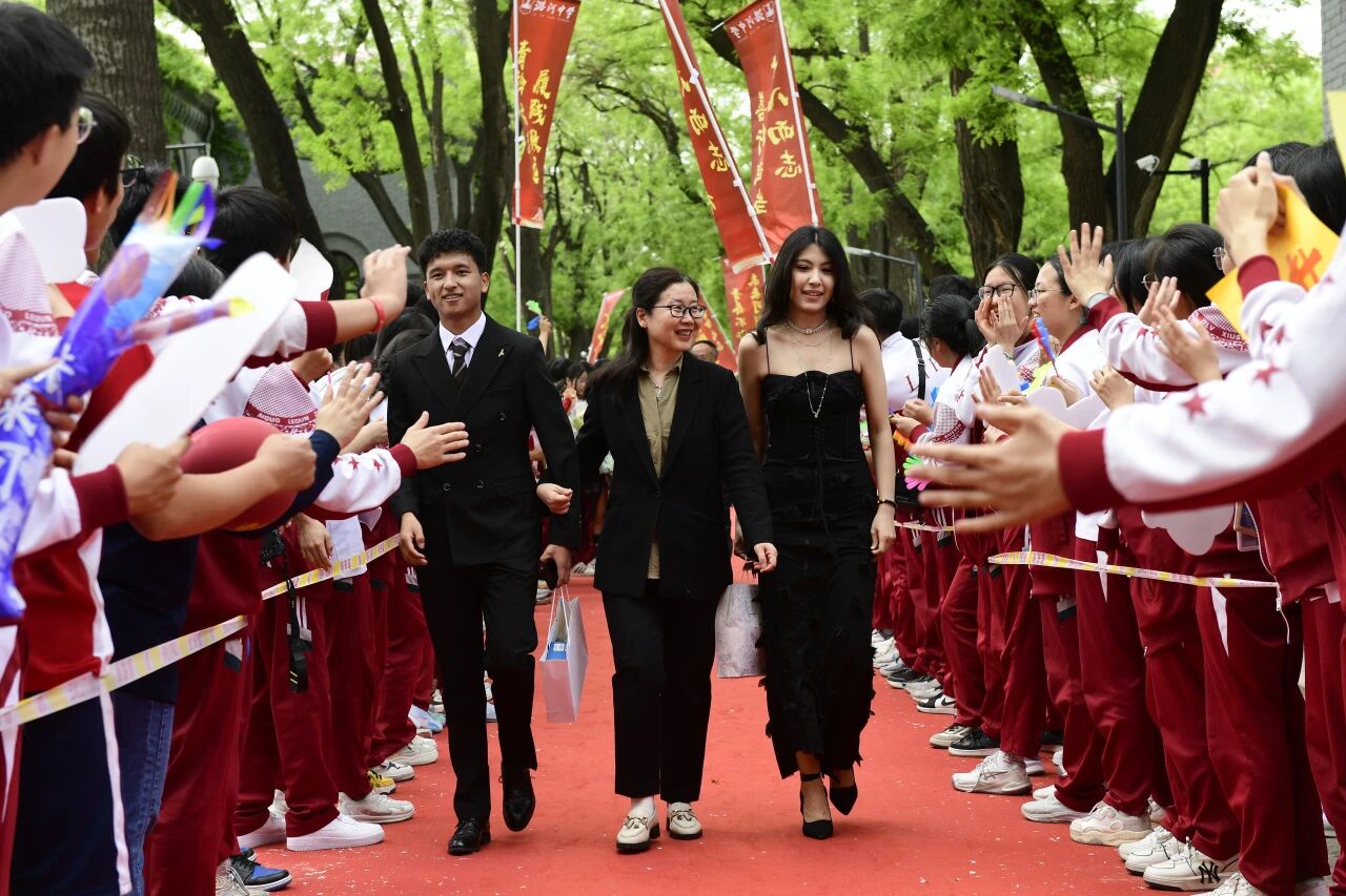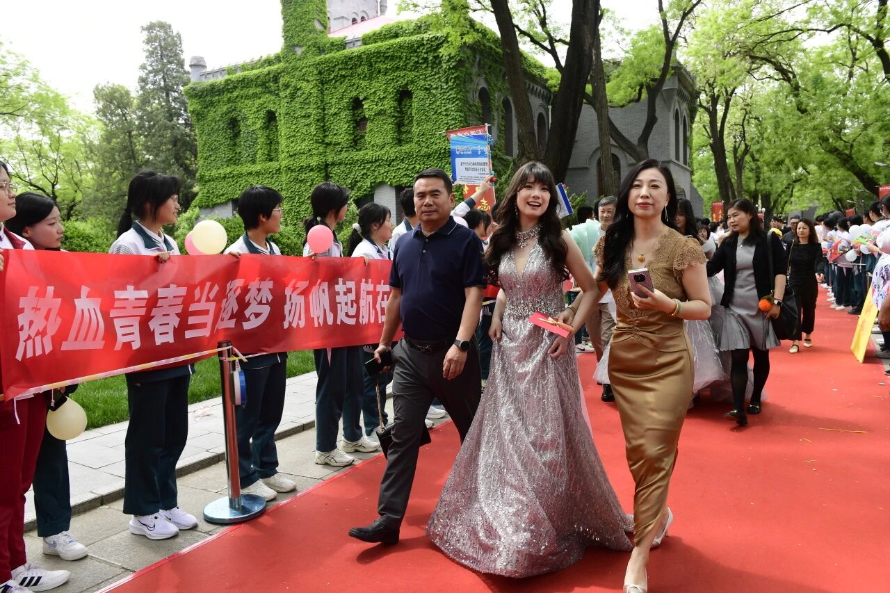 文彬路上,十八歲寄語(yǔ)旗幟獵獵招展,紅毯自天欽樓綿延至成人門(mén),象征從童稚邁向擔(dān)當(dāng)?shù)耐懽。學(xué)子們身著正裝禮服,在父母師長(zhǎng)的陪伴下英姿颯爽走過(guò)紅毯。