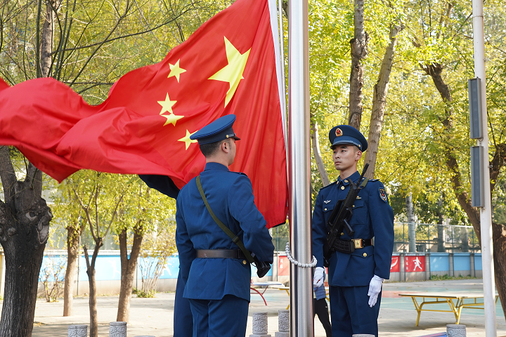 活動在莊嚴(yán)升旗儀式中開場。部隊官兵護送國旗,全體師生肅立,愛國之情激蕩心間。隨后觀看的《厲害了我的國——空天夢想》視頻,讓師生為我國空天成就倍感振奮,對航空事業(yè)向往更甚。