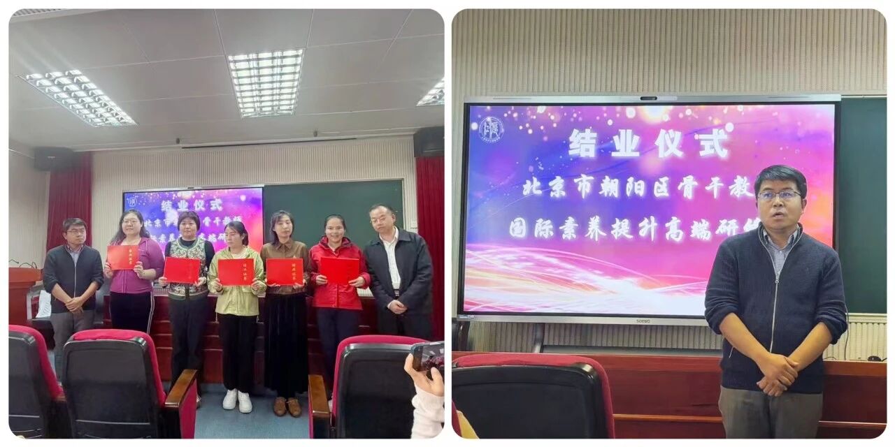 11月3日,研修班舉行結(jié)業(yè)儀式。朝陽區(qū)教師發(fā)展學(xué)院曾志偉副院長和對外交流培訓(xùn)中心侯凱副主任為教師頒發(fā)結(jié)業(yè)證書。侯副主任作活動小結(jié),他充分肯定了老師們在研修期間展現(xiàn)出的積極學(xué)習(xí)態(tài)度與良好精神風(fēng)貌,希望能夠?qū)⒈敬窝行匏鶎W(xué)、所思、所悟轉(zhuǎn)化為實際教學(xué)行動,帶回各自的教育教學(xué)崗位,真正轉(zhuǎn)化為推動學(xué)校發(fā)展、促進學(xué)生成長的現(xiàn)實力量,以骨干之姿引領(lǐng)身邊同事,共同為朝陽區(qū)教育高質(zhì)量發(fā)展添磚加瓦。