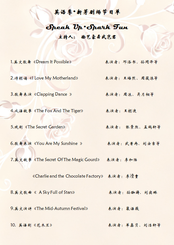 北京工業(yè)大學(xué)附屬中學(xué)新升分!癝peak Up·Spark Fun”英語(yǔ)季·新芽劇場(chǎng)主題活動(dòng)于近日順利開(kāi)展。作為學(xué)校為同學(xué)們搭建的英語(yǔ)展示與實(shí)踐平臺(tái),活動(dòng)由英語(yǔ)組精心策劃,兩位同學(xué)擔(dān)任主持人,所有節(jié)目由一至六年級(jí)的同學(xué)們?nèi)叹食尸F(xiàn)。