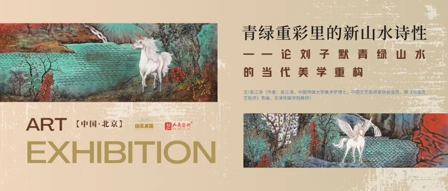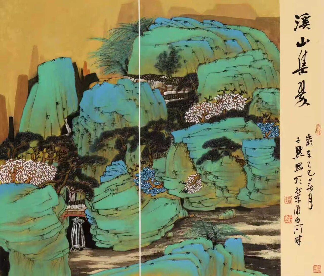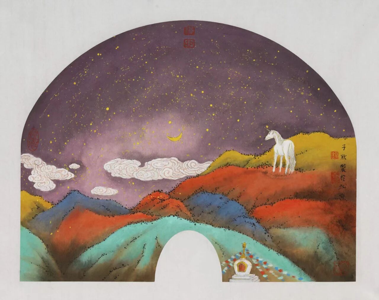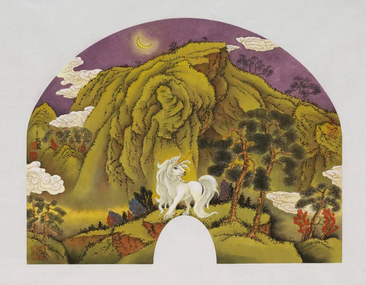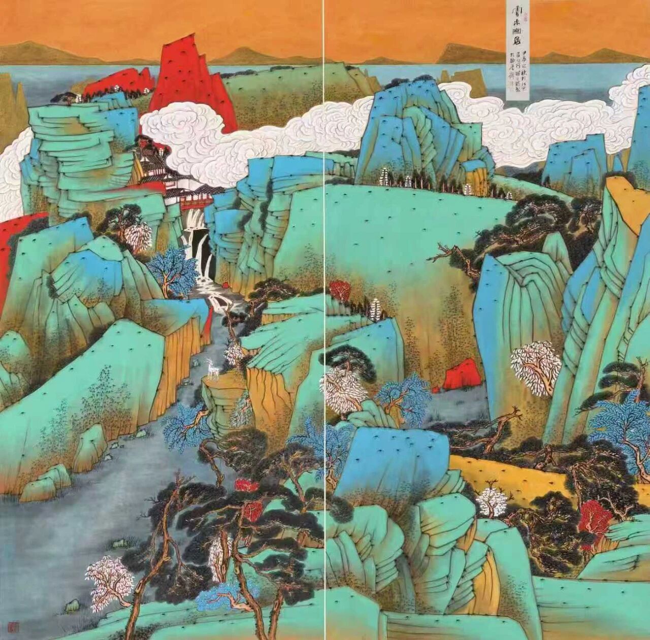 當(dāng)傳統(tǒng)青綠山水的“金碧”底色遇上當(dāng)代藝術(shù)的解構(gòu)思維,劉子默的山水系列作品,便成了一場“古意新象”的視覺實驗:他以重彩為筆、以符號為語,在傳統(tǒng)山水的精神框架里,織就出既恪守文脈又貼近當(dāng)代審美的詩意圖景。從《翠嶺云蹤圖》的層巖疊嶂,到《云蘿幽泉》的獨角獸意象,其作品既帶著《千里江山圖》的色彩基因,又生長出屬于這個時代的浪漫與哲思。