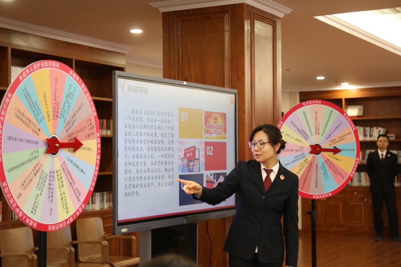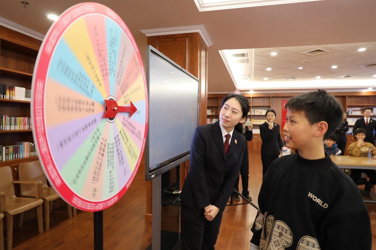 現(xiàn)場還開展了趣味十足的憲法知識轉(zhuǎn)盤問答互動(dòng)環(huán)節(jié)。同學(xué)們踴躍參與,轉(zhuǎn)動(dòng)轉(zhuǎn)盤隨機(jī)抽取與講座內(nèi)容相關(guān)的法律問題,結(jié)合剛學(xué)到的憲法知識、未成年人保護(hù)常識積極作答。檢察官對同學(xué)們的回答逐一進(jìn)行點(diǎn)評指導(dǎo),對回答準(zhǔn)確、思路清晰的同學(xué)現(xiàn)場頒發(fā)小獎(jiǎng)勵(lì),既檢驗(yàn)了學(xué)習(xí)成效,又激發(fā)了大家的參與熱情,現(xiàn)場氛圍熱烈高漲。