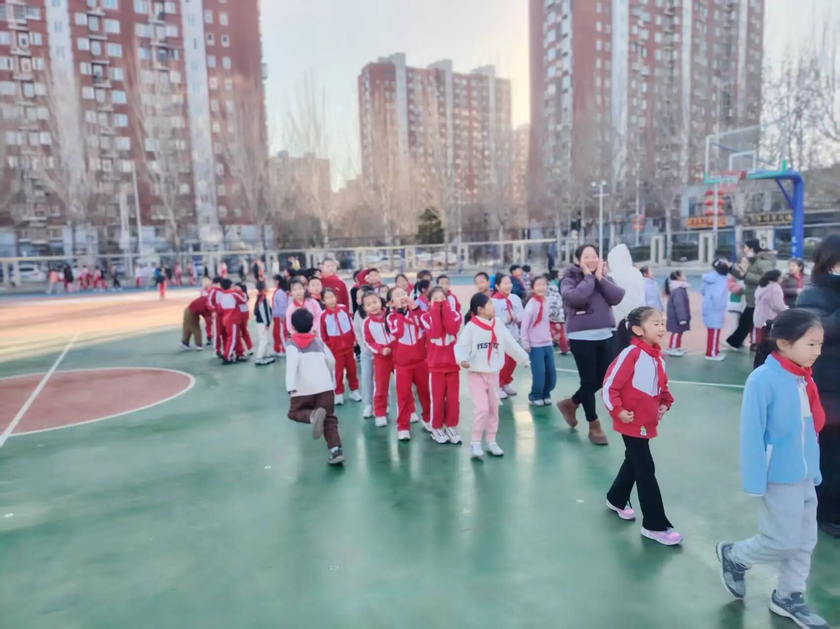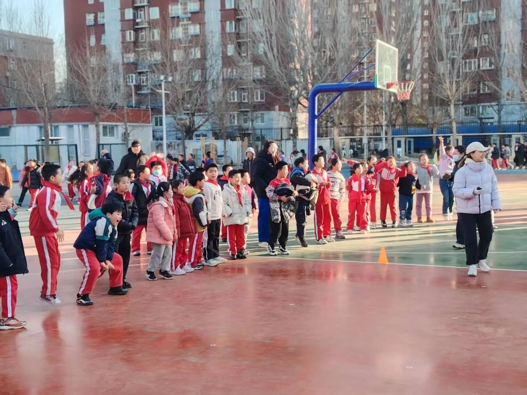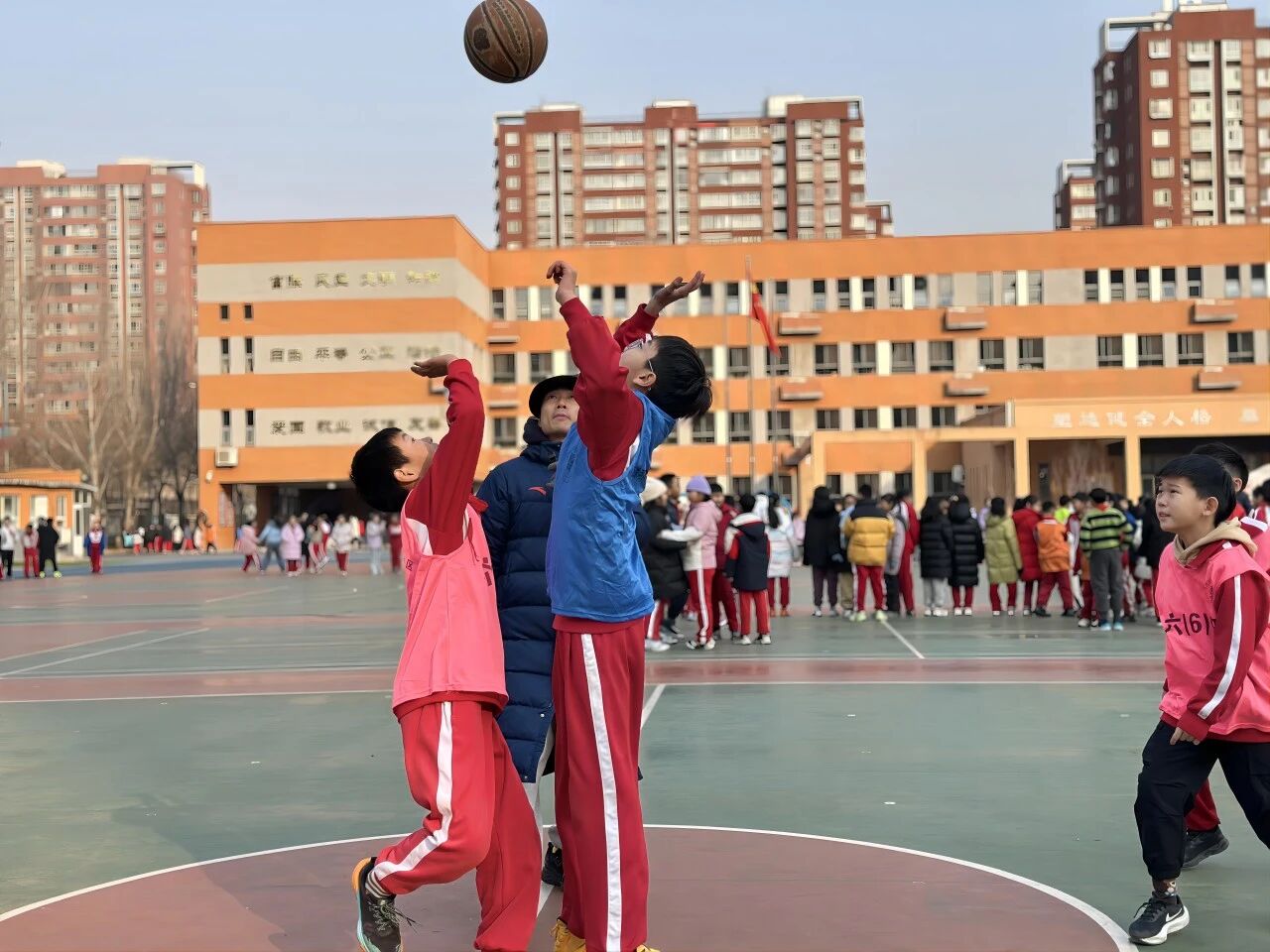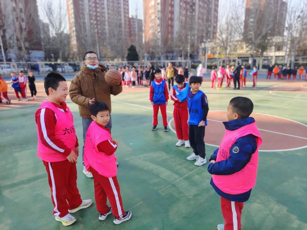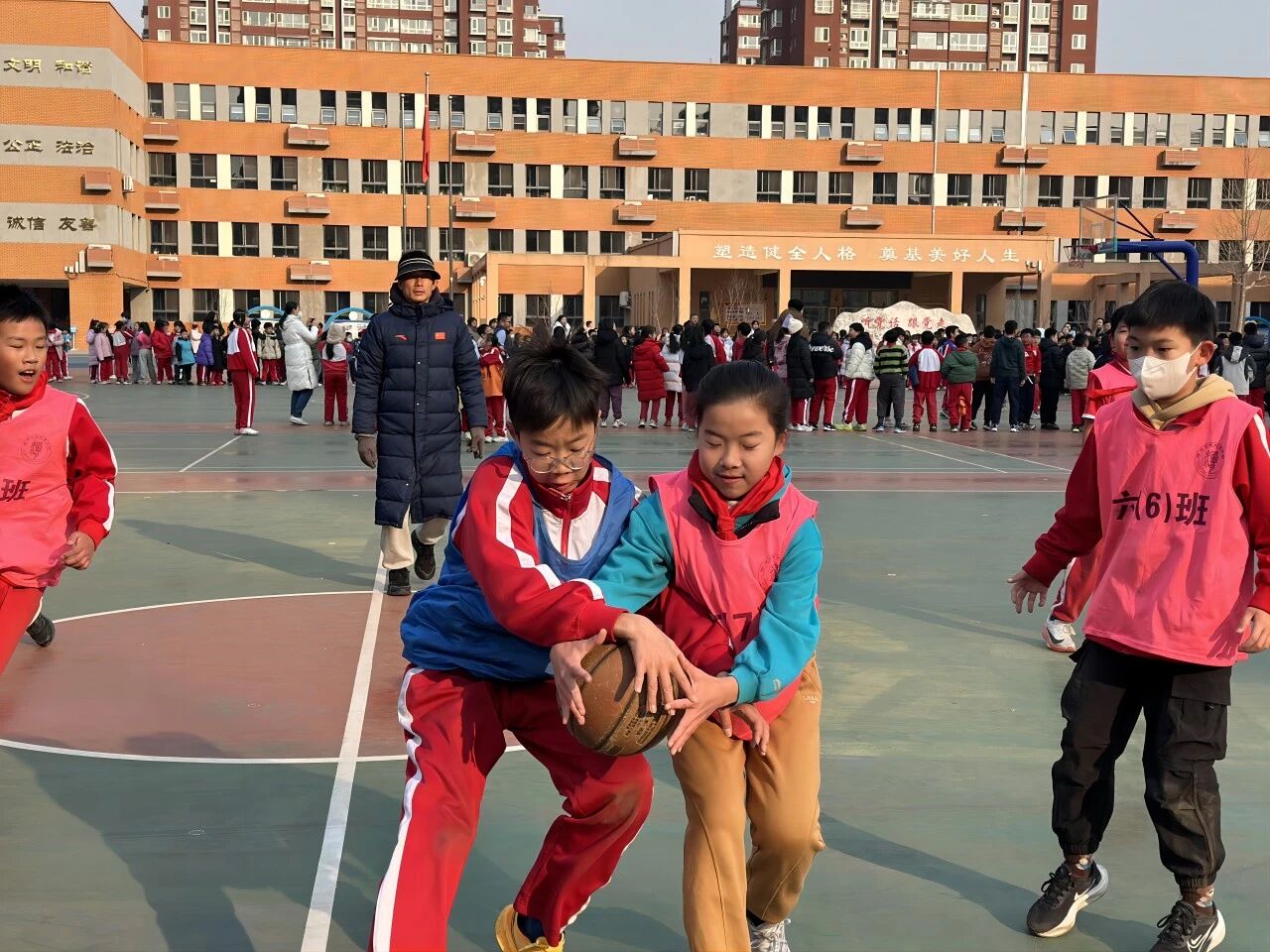三、四年級 3V3 籃球賽的賽場設(shè)在操場的半塊籃球場上,雖場地有限,卻擋不住孩子們的熱情。每班 8 名隊員(6 名主力 + 2 名替補),男女不限的報名規(guī)則讓更多孩子有了上場機會!吧习雸鲫爢T不能參加下半場” 的規(guī)定,讓替補隊員也能充分展現(xiàn)自我,真正實現(xiàn)了 “全員參與”。隨著裁判的哨聲響起,比賽正式開始:球員們壓低重心,靈活運球,眼神緊緊鎖定籃筐;隊友間一個默契的眼神,就能完成一次精準(zhǔn)傳球;面對防守,有人巧妙變向突破,有人果斷起跳投籃,籃球劃過指尖飛向籃筐的瞬間,全場都屏住了呼吸。每當(dāng)進球得分,隊員們會激動地擊掌相擁,替補席上的同學(xué)更是跳起來吶喊,連場邊觀賽的低年級小朋友都揮舞著小拳頭,喊著 “加油!加油!”,家園操場的每一個角落都洋溢著熱血與活力。