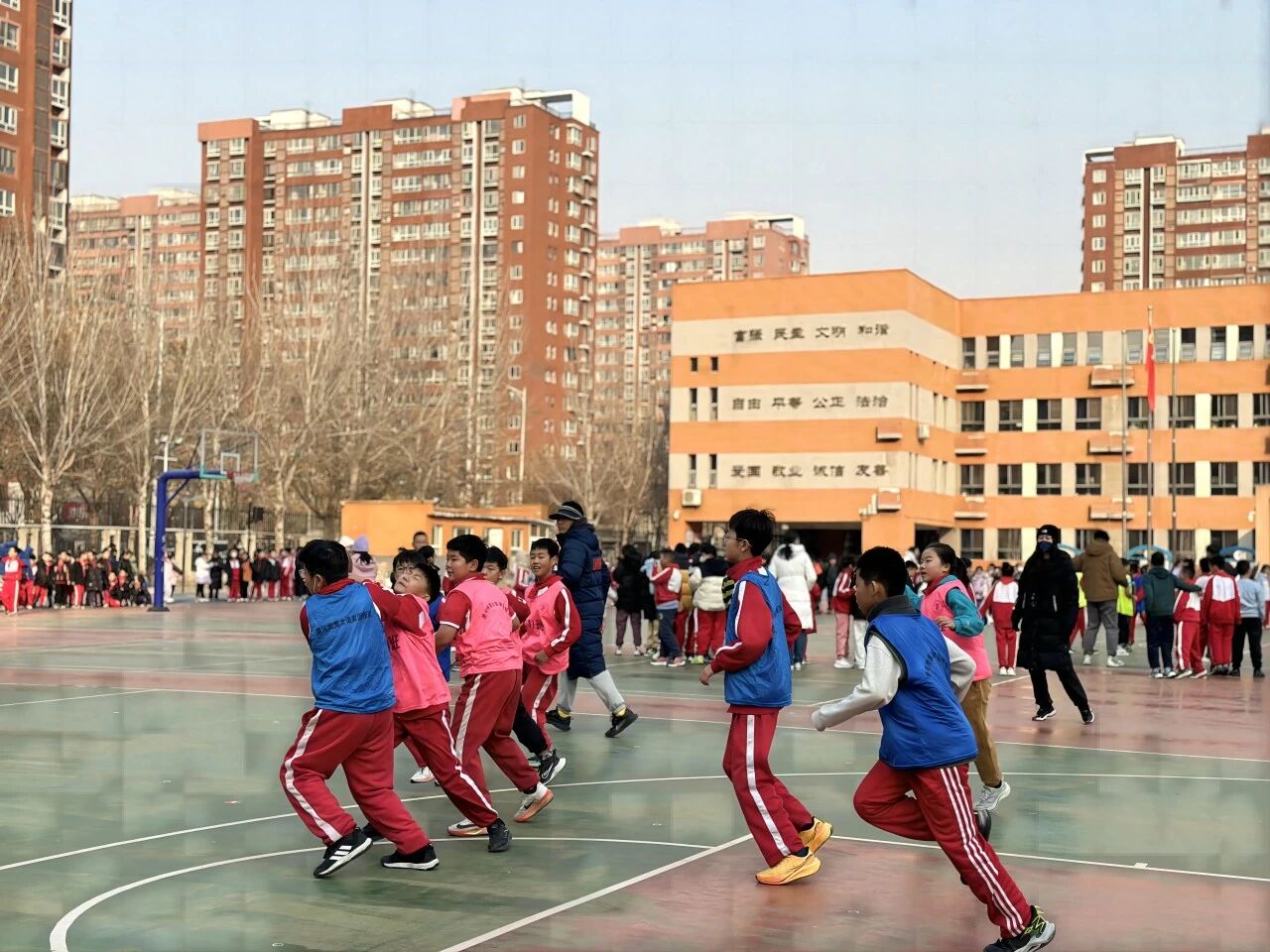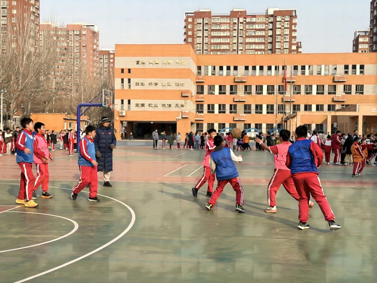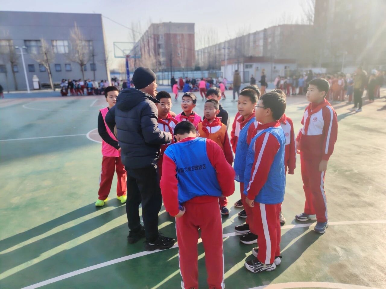 最動人的莫過于孩子們的團結(jié)協(xié)作。有班級在落后時,隊員們沒有抱怨,而是快速圍在一起商量戰(zhàn)術(shù),“我們防守再緊一點!”“傳球快一點,別被斷了!” 簡單的話語里滿是信任;有隊員摔倒了,不等裁判上前,隊友立刻跑過去扶起他,拍掉他身上的塵土,輕聲安慰后一起重回賽場;哪怕是對手進球,也會有人真誠地說一句 “好球”,展現(xiàn)了潞河少年淳樸又純粹的體育精神。4 分鐘的半場時間里,孩子們奔跑、跳躍、搶斷、投籃,每一個動作都拼盡全力,汗水浸濕了球衣,卻澆不滅心中的熱愛。中場休息的 2 分鐘,班主任會快速指導(dǎo)戰(zhàn)術(shù),同學(xué)們遞水、擦汗,小小的團隊里滿是溫暖。