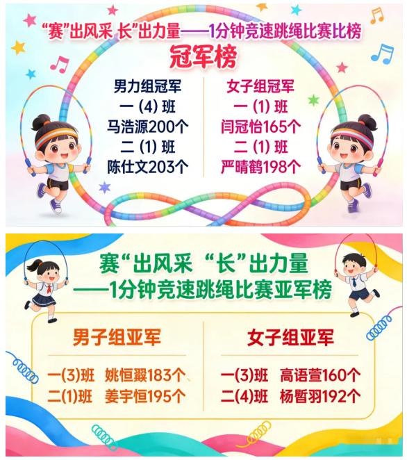 一、二年級的競速跳繩比賽更是萌趣十足。小選手們雙手緊握繩柄,雙腳輕輕起跳,繩子在腳下快速穿梭,像一道道彩色的弧線。有的同學雖然動作略顯稚嫩,但眼神格外堅定,即使不小心絆到繩子,也立刻調整狀態(tài)重新起跳。經過多輪激烈角逐,各年級分別決出了冠、亞、季軍,同時根據(jù)班級整體表現(xiàn)評選出了團體第一、二名。當獎狀送到手中時,小選手們的臉上都綻放出了燦爛的笑容。