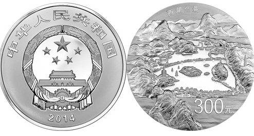 1公斤銀幣為精制幣,正面圖案為中華人民共和國國徽,并刊國名、年號。背面圖案為“西湖全景”景觀造型,并刊“西湖全景字樣及面額。含純銀1公斤,直徑100毫米,面額300元,成色99.9%,最大發(fā)行量300枚。
