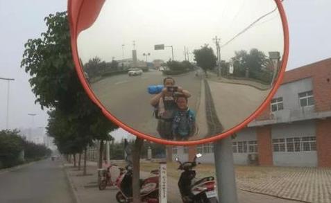 圖為洛陽至西安的400公里的徒步旅途中,有時會略顯枯燥,但拜云鵬父子總會為自己尋找樂趣。受訪者供圖 攝