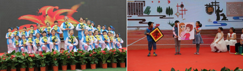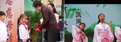 第二部分:活動展示。我校以“傳承孝德訓感恩慈母情”為主題進行了展示活動;顒右浴皞鞒衅焙汀案卸髌眱蓚篇目,以年級為單位,采取誦讀、吟唱、歌舞、情景劇等不同形式進行。