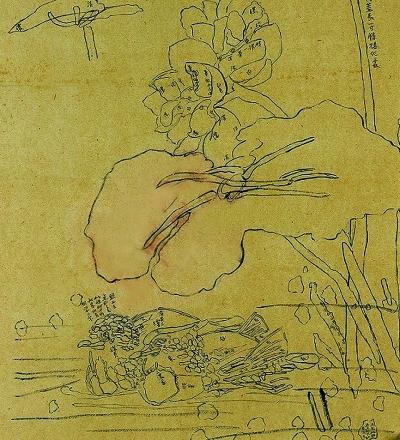 畫稿在齊白石的藝術(shù)創(chuàng)作中發(fā)揮著重要的作用,他往往采用線描加筆記的方法,不僅僅記錄位置、結(jié)構(gòu)而且記錄用什么顏色和用色的深淺。齊白石的很多寫意作品看似一筆揮就,實際上是通過用線描精心安排后畫出的。