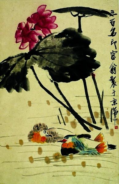 齊白石用于記錄、學習的畫稿很多,其中畫技最為卓越的,經(jīng)歷最為傳奇的是《臨孟麗堂〈芙蓉鴨子〉之二》(圖四)。根據(jù)題跋,齊白石四十余歲的時候游廣西,于乙巳(1905年)向他人借來孟麗堂的作品臨摹。后來家鄉(xiāng)兵變,齊白石帶著臨摹的作品來了北京。己未年(1919),應(yīng)秋江道兄之請再臨摹本,也就是這幅作品。甲戌年(1934),張次溪在沂文齊處得到了這張畫,拿來請齊白石題記,這次與此畫相隔十多年后的重逢不禁讓齊白石感嘆“手跡尤新,鬢毛非舊”。此作筆法老到,墨色典雅,特別是鴨子的形象憨態(tài)可掬,雖為臨習,但是其藝術(shù)水準與一張創(chuàng)作作品已無二致。(周蓉)