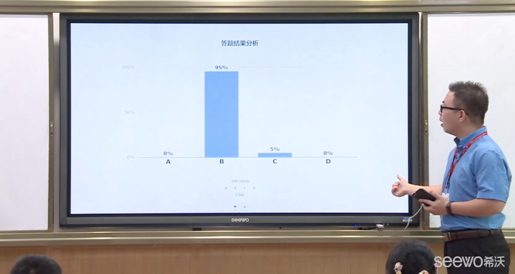 華師附外鄭老師則將互動(dòng)課堂的即時(shí)反饋特性展現(xiàn)得淋漓盡致。每節(jié)課鄭老師都會(huì)設(shè)置隨堂測(cè),對(duì)學(xué)生進(jìn)行當(dāng)堂課的重難點(diǎn)知識(shí)測(cè)試。學(xué)生通過(guò)反饋器進(jìn)行答題后,鄭老師會(huì)根據(jù)答題情況判斷學(xué)生對(duì)重難點(diǎn)知識(shí)的掌握程度,并對(duì)課堂安排進(jìn)行調(diào)整優(yōu)化。學(xué)生掌握得好的題目略講,大多數(shù)學(xué)生做錯(cuò)的則重點(diǎn)講解,以達(dá)到最好的課堂效果。