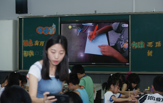 美術(shù)課張老師喜歡把學(xué)生的動(dòng)手過(guò)程通過(guò)移動(dòng)授課終端呈現(xiàn)到大平板上,即時(shí)與全班同學(xué)分享動(dòng)手示范。她表示這樣不僅有助于提高學(xué)生的學(xué)習(xí)主動(dòng)性,還能加強(qiáng)學(xué)生與學(xué)生之間的互動(dòng):“我的示范、小朋友的示范以及一些視頻欣賞,能夠比較直觀地給學(xué)生啟發(fā)!