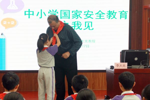 李大光教授主要研究領(lǐng)域是國家安全、軍事戰(zhàn)略、軍事裝備和國際政治。在軍內(nèi)外報刊雜志上發(fā)表學(xué)術(shù)論文和時評文章1500余篇。面對如此優(yōu)秀的科普教育工作者,少先隊員代表懷著激動的心情,為李教授敬獻并佩戴了鮮艷的紅領(lǐng)巾,同時,科普講作也拉開了序幕。