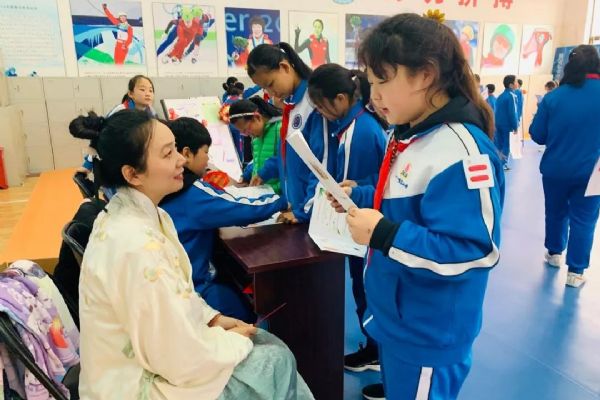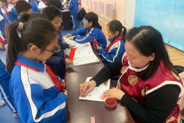 活動當(dāng)天,學(xué)生們手持英語節(jié)日交流手冊到各個展位進(jìn)行交流,能正確表達(dá)相應(yīng)節(jié)日的用語及習(xí)俗,就會得到通關(guān)印章和小禮物,集齊春節(jié)、端午節(jié)、元宵節(jié)等六個節(jié)日的印章就完成通關(guān)賽。