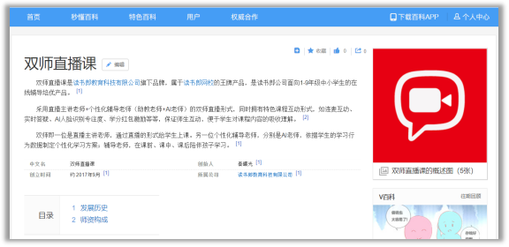 在百科搜索雙師直播課,可以了解到讀書(shū)郎雙師直播課2017年11月開(kāi)課,至今發(fā)展已有3年。是讀書(shū)郎跨界在線教育,主打的王牌課程,主要專(zhuān)注1-9年級(jí)中小學(xué)培優(yōu)輔導(dǎo),在課程體系、師資力量、教學(xué)流程、互動(dòng)形式等多有創(chuàng)新、模式也較為成熟,具有六大核心優(yōu)勢(shì)。