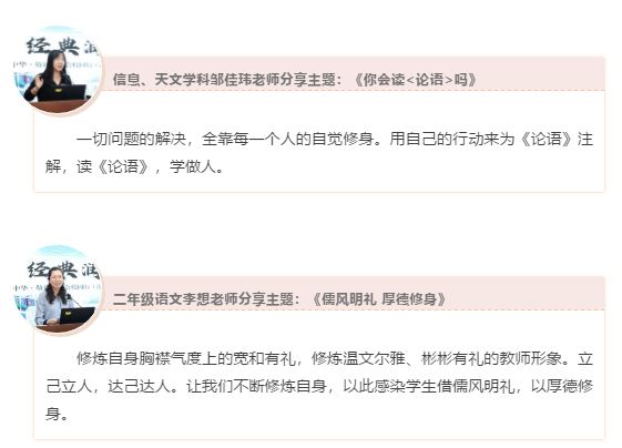 圖強(qiáng)第二小學(xué)參與課程學(xué)習(xí)的十位教師,在活動(dòng)中結(jié)合自己的真情實(shí)感分享了他們研讀《論語》《大學(xué)》等中華經(jīng)典的體會(huì)與收獲,得到了與會(huì)專家學(xué)者的高度評(píng)價(jià),老師們的發(fā)言不但帶給所有參會(huì)教師思想的啟發(fā),同時(shí)也引發(fā)了深刻的思想共鳴,本次活動(dòng)與其說是一次讀書心得的分享,不如說是一場(chǎng)思想認(rèn)識(shí)的碰撞,更是一番對(duì)中華文化的深度解讀。