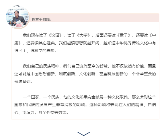 程方平先生現(xiàn)場(chǎng)為每一位發(fā)言教師進(jìn)行了精彩點(diǎn)評(píng),在進(jìn)一步發(fā)掘思想亮點(diǎn),實(shí)踐特色的同時(shí),結(jié)合教育教學(xué)實(shí)際提出了繼續(xù)改進(jìn)和提升的建議,從思想、認(rèn)識(shí)、策略、方法等諸多層面給予老師們深刻的啟發(fā)和指導(dǎo)。先生在點(diǎn)評(píng)的基礎(chǔ)上還欣然為老師們做了精彩的學(xué)術(shù)報(bào)告。先生強(qiáng)調(diào):中華優(yōu)秀傳統(tǒng)文化能夠增強(qiáng)民族自信心和凝聚力,作為教師必須對(duì)此有真切的體會(huì)、感知和共識(shí),要積極、主動(dòng)的學(xué)習(xí)我們這個(gè)民族優(yōu)秀的傳統(tǒng)文化,深刻領(lǐng)悟“學(xué)”的真諦,“教”的真諦。作為教師要不斷培養(yǎng)自己的學(xué)習(xí)能力,提高自己的學(xué)習(xí)水平,發(fā)揮自己的學(xué)習(xí)優(yōu)勢(shì),向?qū)W生傳遞學(xué)習(xí)方法,讓學(xué)生“愛學(xué)”“向?qū)W”“樂學(xué)”。很多人為什么對(duì)小學(xué)老師一生都感激?因?yàn)槲覀兊男W(xué)老師給他們打下非常好的基礎(chǔ),這些基礎(chǔ)是一生受益。