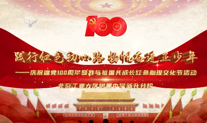 2021年,是中國(guó)共產(chǎn)黨建黨100周年。黨的100年,是不忘初心、與時(shí)俱、開創(chuàng)輝煌的100年。為了慶祝黨的百年華誕,厚植愛國(guó)情懷。2021年4月29日下午,北京工業(yè)大學(xué)附屬中學(xué)新升分校隆重舉行“踐行紅色初心路 揚(yáng)帆奮進(jìn)正少年”慶祝建黨100周年暨我與祖國(guó)共成長(zhǎng)紅色心理文化節(jié)活動(dòng)。