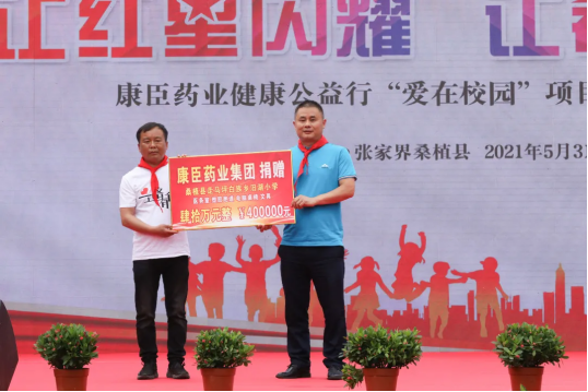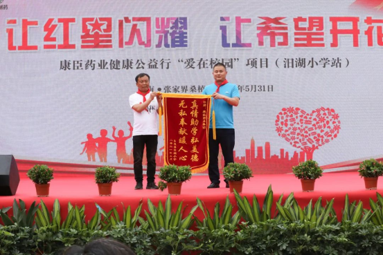 在活動中,汨湖小學公益項目負責人彭俊先生代表康臣藥業(yè)集團向汨湖小學校長滿玉苗轉交了捐贈牌,并接收了學校贈與的感謝錦旗。彭俊在代表公司的致辭中表示:“作為一家負有使命感的企業(yè),康臣藥業(yè)集團始終積極踐行社會公益事業(yè),努力將責任和愛傳遞到每個需要的地方。十年樹木,百年樹人,教育是國之大計,是國家未來發(fā)展的基石,是社會未來的希望。桑植縣汨湖小學,是康臣‘愛在校園’項目的起點,也是康臣健康公益行系列活動的重要一站。未來,康臣會繼續(xù)關注困難地區(qū)青少年的成長,推動紅星醫(yī)務室公益項目的建設,用實際行動支持國家鄉(xiāng)村振興戰(zhàn)略,助力社會發(fā)展建設。”