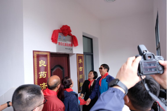現(xiàn)場,安郁寶先生、黎倩女士,與闕玉英同志、向左輝同志為全國首個“紅星醫(yī)務室”揭牌。