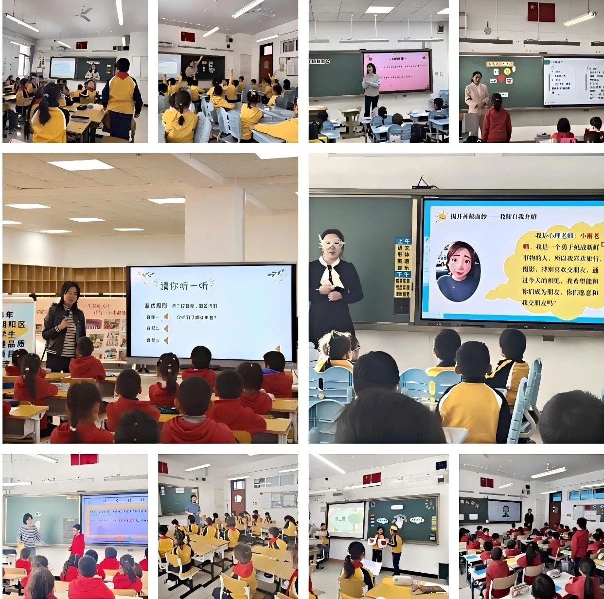 會(huì)議伊始,北京市朝陽區(qū)外國(guó)語學(xué)校劉思雨,北京師范大學(xué)朝陽附屬學(xué)校李璇、逯遹,中國(guó)科學(xué)院附屬實(shí)驗(yàn)學(xué)校焦玉聰、劉碩,清華大學(xué)附屬中學(xué)朝陽學(xué)校莊春妹,中國(guó)音樂學(xué)院附屬北京實(shí)驗(yàn)學(xué)校任春穎,北京市陳經(jīng)綸中學(xué)新教育實(shí)驗(yàn)分校宣雅馨,北京景山學(xué)校朝陽學(xué)校吳伊娜,北京市朝陽區(qū)垂楊柳中心小學(xué)景園分校賀春平共10位優(yōu)秀心理教師在學(xué)校的1-3年級(jí)10個(gè)班同時(shí)進(jìn)行了《陽光心態(tài)》課程展示。一年級(jí)3個(gè)班、二年級(jí)4個(gè)班、三年級(jí)3個(gè)班分別進(jìn)行“適應(yīng)+喜悅”“同理+感恩”“合作+希望”主題課的同課異構(gòu)。與會(huì)嘉賓隨機(jī)進(jìn)入班級(jí)觀摩課程。教師們借班上課,依然呈現(xiàn)出良好的課堂效果,體現(xiàn)了課程設(shè)計(jì)的標(biāo)準(zhǔn)化和可操作性,也展示出課程師資培訓(xùn)和全區(qū)推廣的成效。課后,孩子們?yōu)槔蠋焸儷I(xiàn)上鮮花表達(dá)感謝。