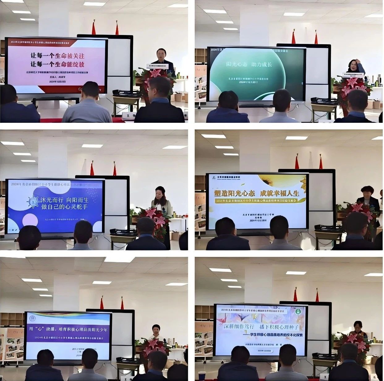 來自北京師范大學(xué)朝陽附屬學(xué)校尚建軍校長(zhǎng)、北京市朝陽區(qū)垂楊柳中心小學(xué)勁松分校馬守鳳校長(zhǎng)、北京市朝陽外國(guó)語學(xué)校小學(xué)部高俊梅校長(zhǎng)、清華大學(xué)附屬中學(xué)朝陽學(xué)校王建平副校長(zhǎng)、北京市朝陽區(qū)芳草地國(guó)際學(xué)校遠(yuǎn)洋小學(xué)李梅副校長(zhǎng)、中國(guó)音樂學(xué)院附屬北京實(shí)驗(yàn)學(xué)校鄭菊副校長(zhǎng)6位領(lǐng)導(dǎo)分別結(jié)合各自學(xué)校的陽光心態(tài)教育教學(xué)情況進(jìn)行總結(jié)匯報(bào)。這讓與會(huì)干部教師更直觀的感受到積極心理品質(zhì)課程已深度融入到學(xué)校的整體教育教學(xué)的工作體系之中,成為學(xué)校管理、教師發(fā)展和學(xué)生成長(zhǎng)的重要助力。
