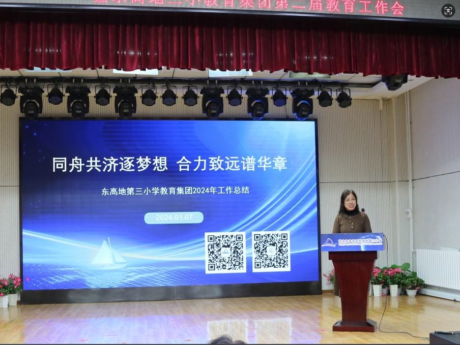東高地三小教育集團(tuán)牽頭校陳翠敏校長(zhǎng)以《同舟共濟(jì)逐夢(mèng)想 合力致遠(yuǎn)譜華章》為主題,從集團(tuán)的穩(wěn)步發(fā)展、精準(zhǔn)發(fā)力、共榮發(fā)光、全新發(fā)軔四個(gè)方面回顧了集團(tuán)的工作,并提出了對(duì)未來(lái)發(fā)展的設(shè)想。她強(qiáng)調(diào):未來(lái),挑戰(zhàn)與機(jī)遇并存,新的征程呼喚新的擔(dān)當(dāng)與作為!案髅琅c共綻華光,攜手并進(jìn)啟新航”,并不是一句口號(hào),而是大家踐行的承諾。相信在教委的指引下,在全體同仁的齊心奮進(jìn)中,東高地三小教育集團(tuán)定能乘風(fēng)破浪,駛向更為遼闊的教育天地,培育出更多德才兼?zhèn)涞臈澚褐,為教育事業(yè)書(shū)寫(xiě)更為絢爛的華章!