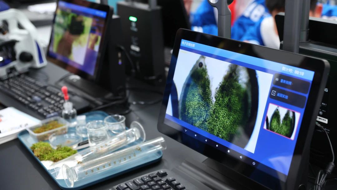 李玉瑩老師以“苔蘚的保水機(jī)制”為切入點(diǎn),借助智能顯微成像設(shè)備,帶領(lǐng)學(xué)生多維度觀察葫蘆蘚的假根與孢蒴結(jié)構(gòu)。課堂通過(guò)“苔蘚保水能力測(cè)試”實(shí)驗(yàn),量化分析土壤含水率變化,并結(jié)合顯微影像展示苔蘚保水結(jié)構(gòu)特性。李老師以“結(jié)構(gòu)—功能—生態(tài)價(jià)值”為邏輯鏈,引導(dǎo)學(xué)生構(gòu)建苔蘚固沙蓄水的科學(xué)認(rèn)知,在真實(shí)數(shù)據(jù)中深化實(shí)證思維,彰顯“技術(shù)賦能探究”的課堂特色。