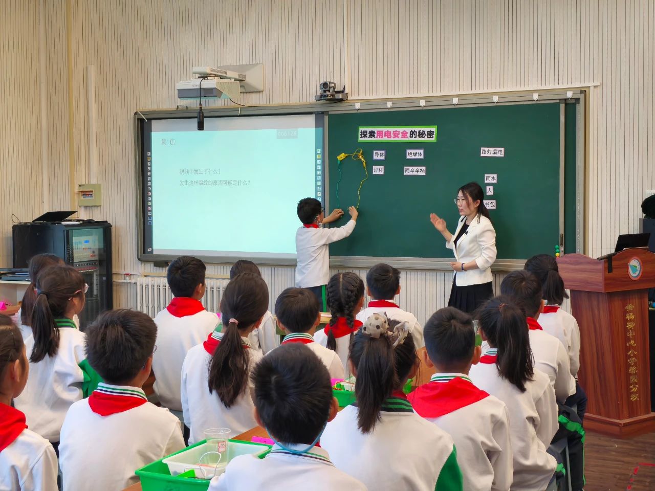 第二節(jié)課由垂楊柳中心小學(xué)馨園分校的陳秋萍老師為大家呈現(xiàn)了“探索用電安全的秘密”一課。本課以生活中的用電安全為切入點(diǎn),通過(guò)新聞短視頻問(wèn)題情景的創(chuàng)設(shè),迅速吸引了學(xué)生的注意力,并有效激發(fā)了學(xué)生的探究興趣。在教學(xué)過(guò)程中,陳老師運(yùn)用電流表等實(shí)驗(yàn)器材,組織學(xué)生進(jìn)行了一系列探究活動(dòng)。學(xué)生不僅在實(shí)踐中加深了對(duì)導(dǎo)體和絕緣體概念的理解,還通過(guò)親自操作、觀察、記錄,鍛煉了科學(xué)探究能力。同時(shí),陳老師注重培養(yǎng)學(xué)生的安全意識(shí)和實(shí)證精神,反復(fù)強(qiáng)調(diào)實(shí)驗(yàn)操作的規(guī)范性和生活用電的危險(xiǎn)性,使學(xué)生深刻認(rèn)識(shí)到安全用電的重要性。此外,陳老師在課堂上有效地實(shí)現(xiàn)了“教學(xué)評(píng)”一體化教學(xué)行為,在引導(dǎo)學(xué)生思考、交流后,學(xué)生發(fā)表自己的觀點(diǎn)和見(jiàn)解,開(kāi)展教師點(diǎn)評(píng)與學(xué)生互評(píng),有效達(dá)成學(xué)生掌握安全用電的科學(xué)觀念。