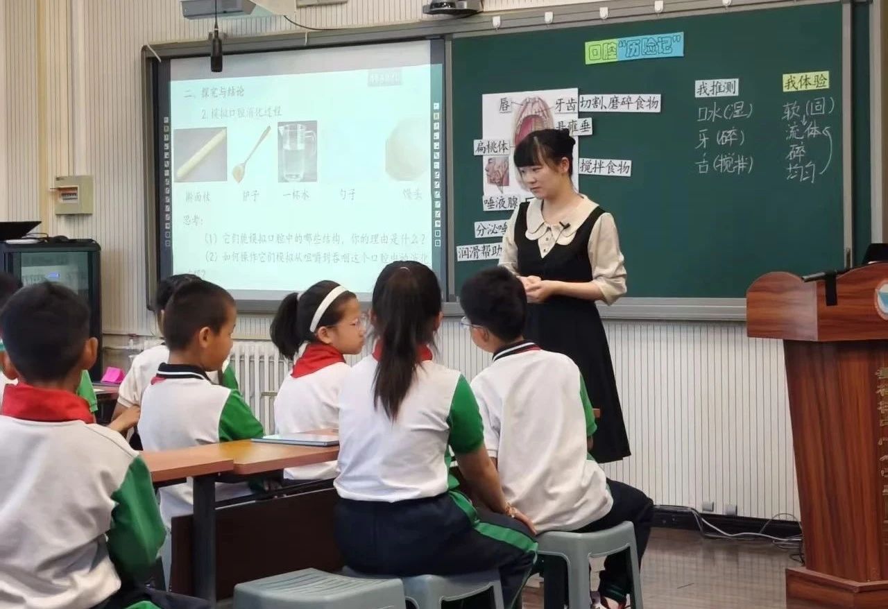 活動(dòng)開(kāi)始,首先由垂楊柳中心小學(xué)馨園分校的劉婉英老師帶來(lái)了一節(jié)三年級(jí)的“口腔歷險(xiǎn)記”,讓學(xué)生在真實(shí)探究口腔的結(jié)構(gòu)中,發(fā)現(xiàn)口腔的消化功能。首先劉老師引導(dǎo)學(xué)生咀嚼饅頭、體會(huì)饅頭在口腔內(nèi)的變化,然后閱讀資料發(fā)現(xiàn)問(wèn)題本質(zhì)、模擬實(shí)驗(yàn)探究口腔結(jié)構(gòu)與功能的關(guān)系,學(xué)生在問(wèn)題探究活動(dòng)中深入學(xué)習(xí)本課的核心知識(shí),實(shí)現(xiàn)科學(xué)素養(yǎng)的培養(yǎng)。結(jié)合過(guò)程性評(píng)價(jià)使用AI-APD賦能教學(xué),強(qiáng)化評(píng)價(jià)效果,不僅實(shí)現(xiàn)實(shí)驗(yàn)結(jié)果的有效收集與整理,也提升了評(píng)價(jià)的科學(xué)性和客觀性。