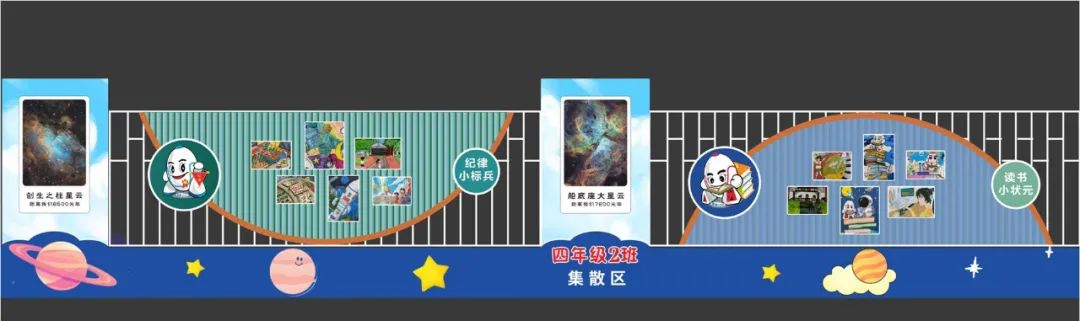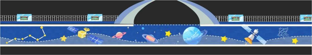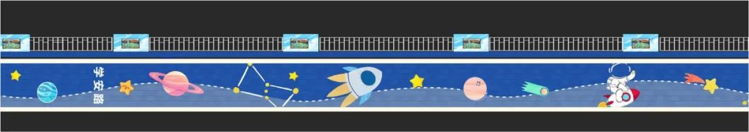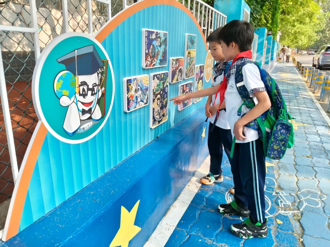 漫步學(xué)安路,航天元素與校園文化交相輝映,形成獨(dú)特的視覺(jué)語(yǔ)言。道路顯眼位置設(shè)置的航天主題文化墻,以活潑的卡通風(fēng)格呈現(xiàn)火箭升空、宇航員漫步星際等場(chǎng)景,既傳遞“減速慢行” 的安全提示,又潛移默化地普及航天知識(shí)。各大星云圖也成為學(xué)生討論學(xué)習(xí)的熱點(diǎn)。校門口左右兩側(cè)的展示區(qū),更成為了校園文化的“微窗口”,繪畫作品記錄的校園生活場(chǎng)景,展示出學(xué)生在德、智、體、美、勞等方面全面發(fā)展。