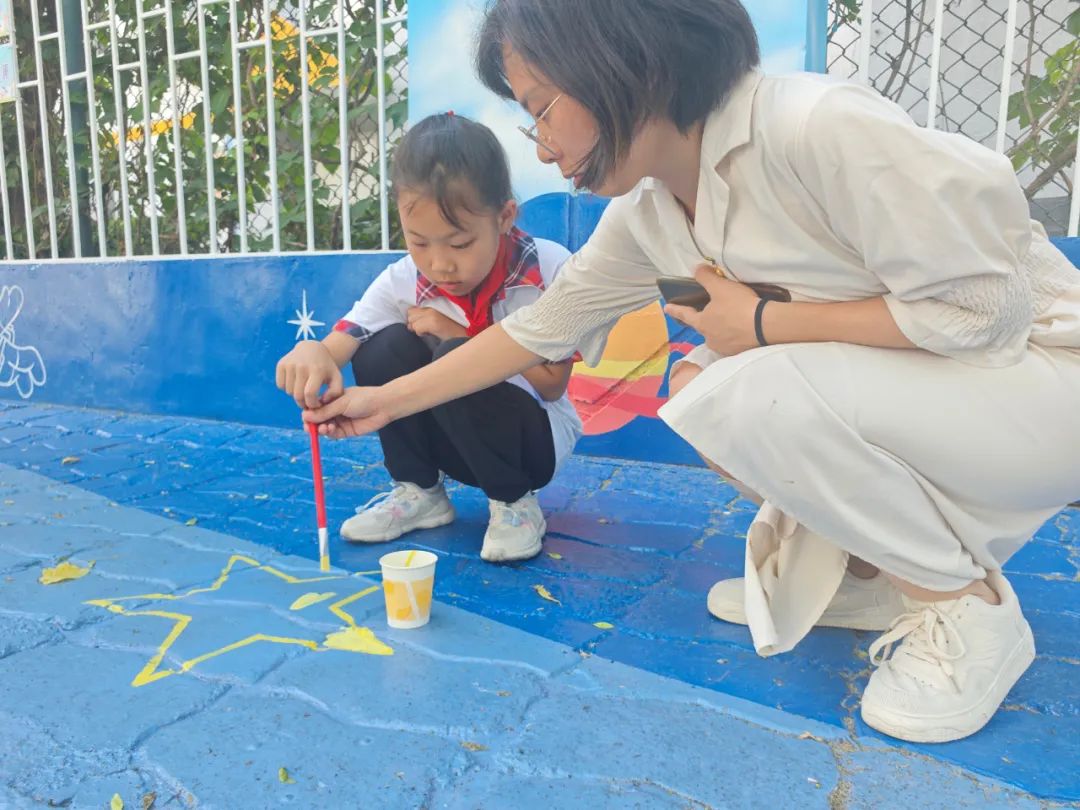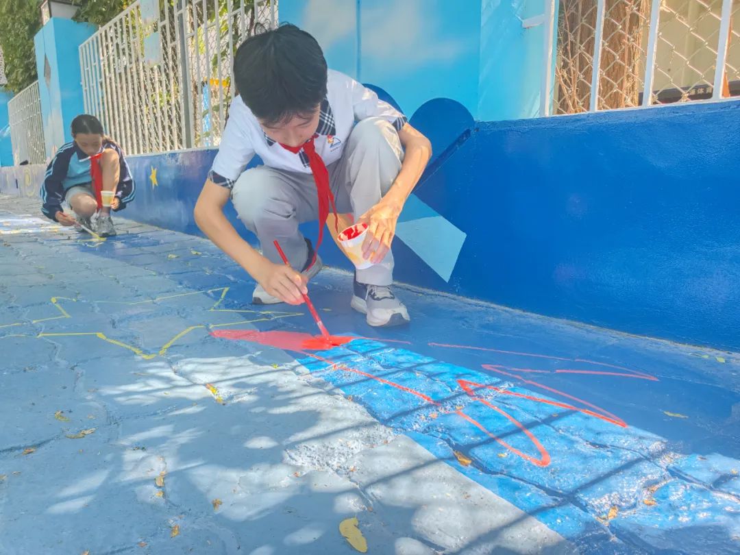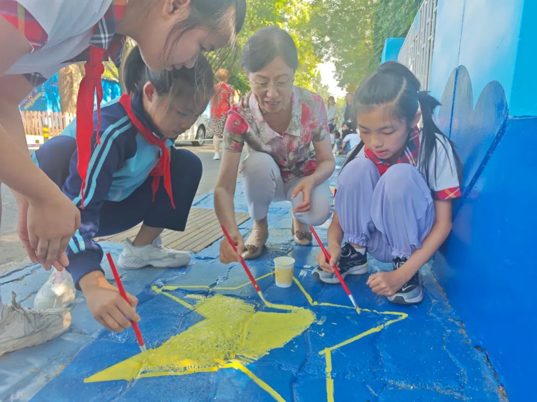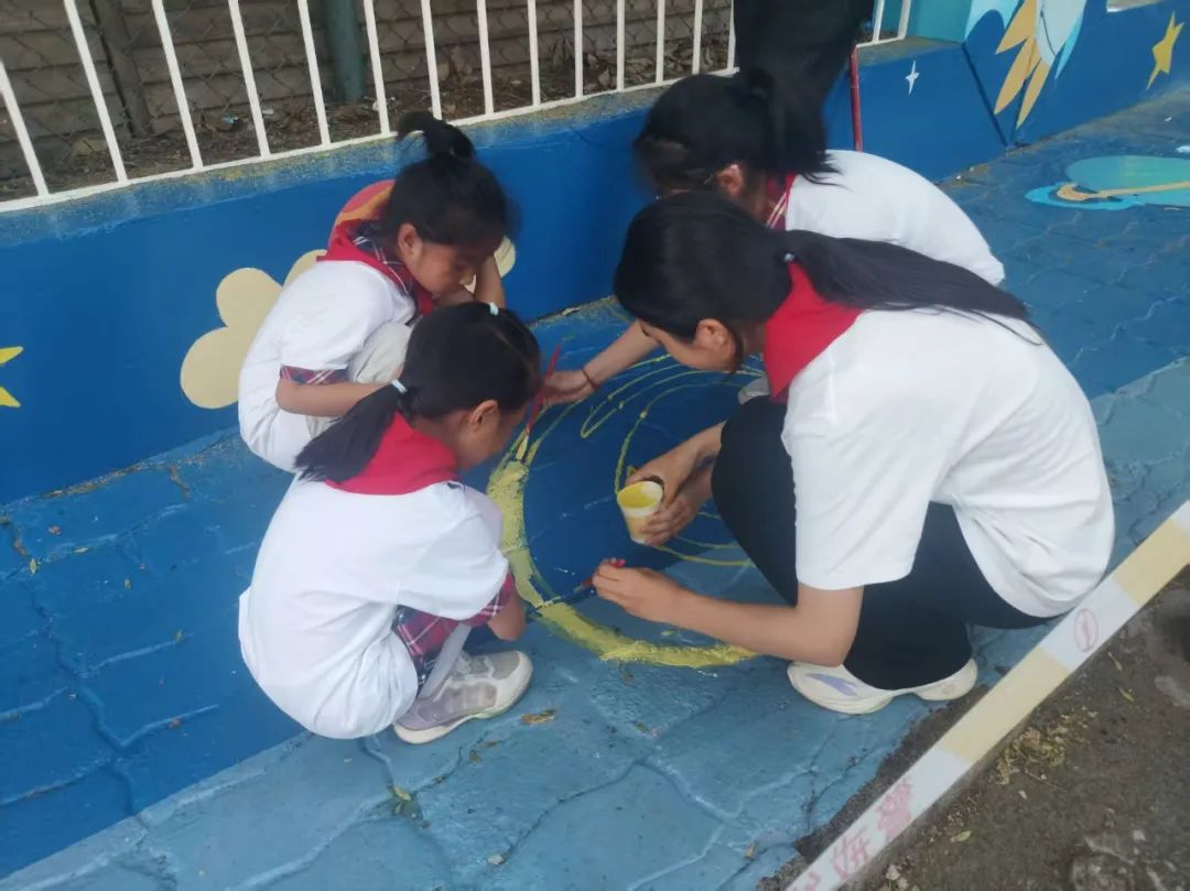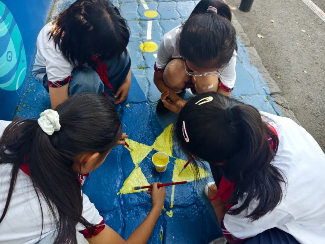 部分學(xué)生代表參與了學(xué)安路星際圖景的繪畫。他們用顏料點(diǎn)綴出星星的閃爍質(zhì)感,畫出彎月的溫柔弧度,還在月亮周圍添上夢(mèng)幻的光暈......同學(xué)們一邊繪畫,一邊互相交流著對(duì)宇宙的憧憬,分享著自己筆下每個(gè)細(xì)節(jié)的創(chuàng)意來(lái)源,仿佛將對(duì)太空的向往都傾注在了繪畫過(guò)程中。