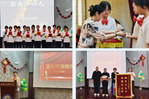 雅樂致敬:女生小合唱《裹著心的光》輕揚而起,“逆風也不投降”的旋律恰似少年拼搏之姿,與學子們的青春熱血遙相呼應;學子感懷:優(yōu)秀畢業(yè)生代表馬嶼桐款款道來:“足球場上的吶喊震天,演講臺上的激昂回響,屯一的千余日夜,是我們以夢想為線編織的成長錦緞!奔议L贈言:黃樂妮媽媽化用《少年中國說》以壯行色:“中考場上少年志,身如山河挺脊梁”,更贈箴言 “以師者智慧為羅盤,以父母之愛為鎧甲”;致謝之禮:家長代表手捧繡有 “桃李滿天下,雨露潤春華”的錦旗贈予學校,答謝學校三年來對孩子們的悉心培育。