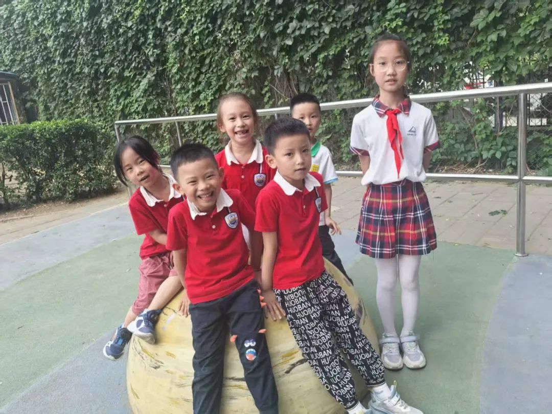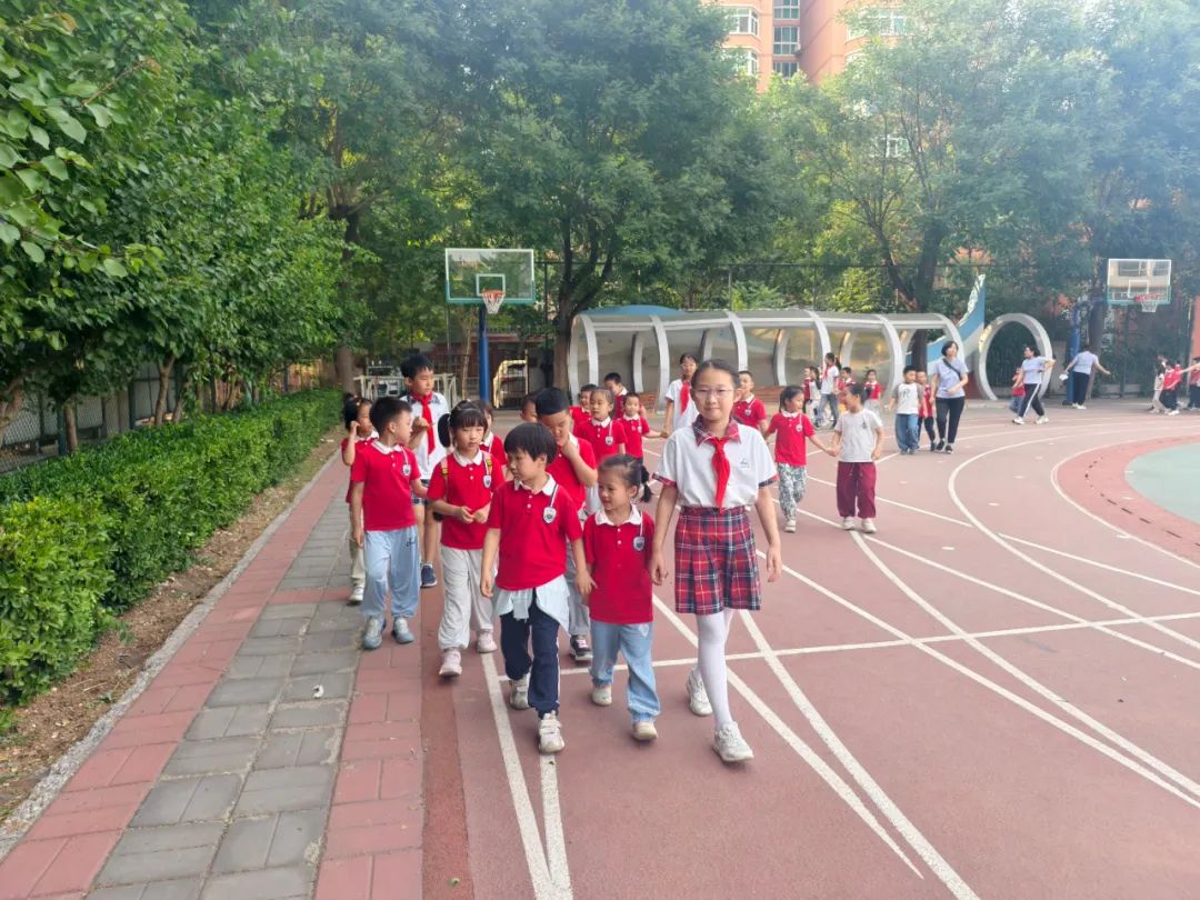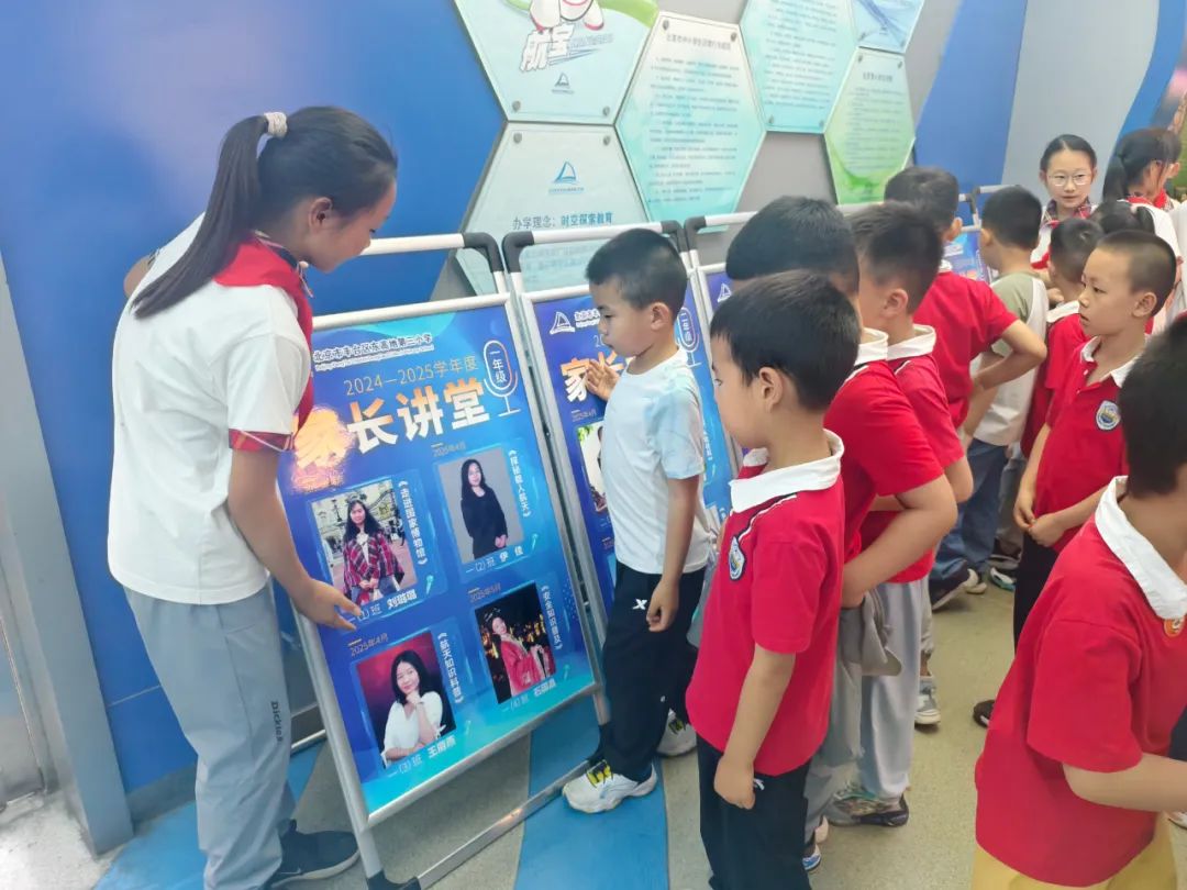在少先隊(duì)員代表的引導(dǎo)下,幼兒園小朋友們分成小組,開啟“校園探秘”之旅。少先隊(duì)員們佩戴鮮艷紅領(lǐng)巾,化身“小導(dǎo)游”,帶領(lǐng)小朋友們依次參觀校園環(huán)境:在操場、跑道邊,少先隊(duì)員們示范跑步動作,小朋友們模仿著擺臂踏步,感受校園運(yùn)動的活力;走進(jìn)時空長廊及太陽系活動區(qū),孩子們一起熱議行星知識;閱讀亭中,少先隊(duì)員分享日常讀書趣事......