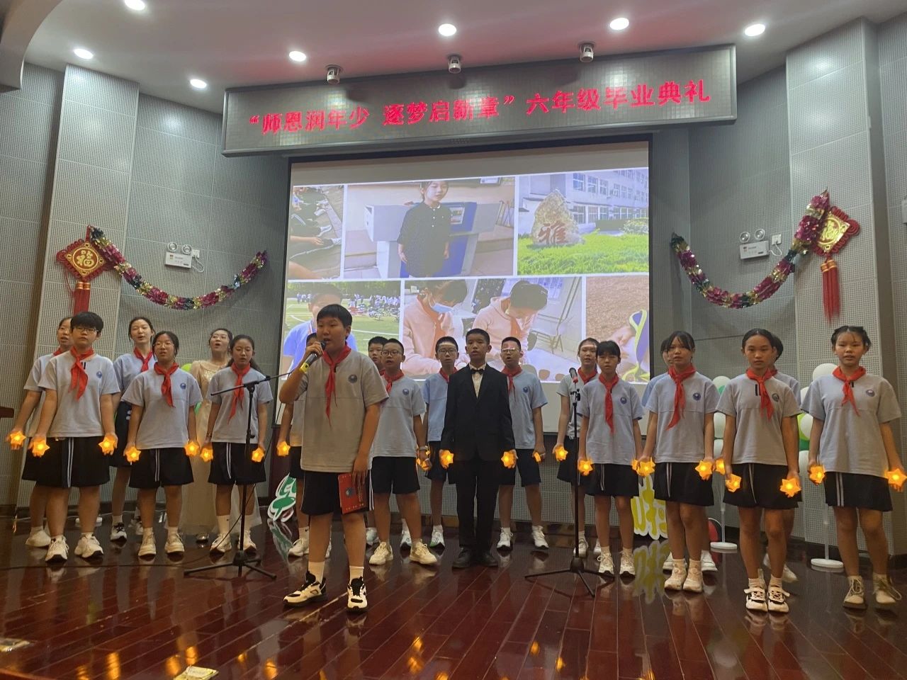 “六年前帶著懵懂走進(jìn)校園,六年后,我們即將帶著師恩與夢(mèng)想奔赴遠(yuǎn)方!敝鞒秩藙㈣骱愫筒裼贻嫱瑢W(xué)宣布畢業(yè)典禮正式開(kāi)始。