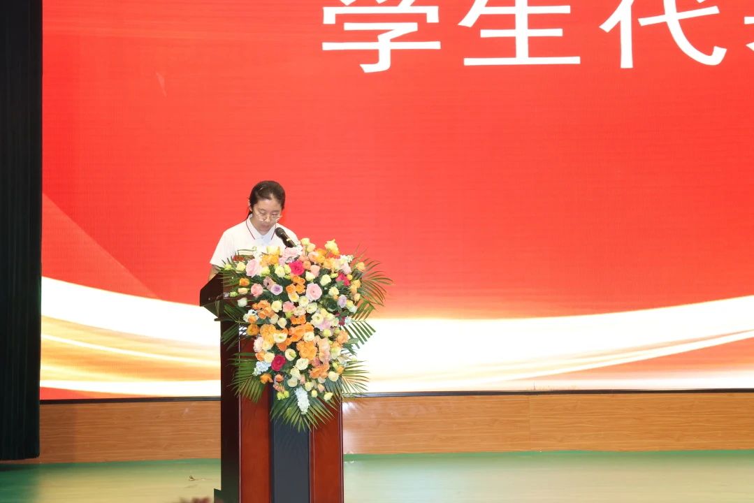 畢業(yè)生代表初三4班高子涵同學上臺發(fā)言。她分享了三年的收獲與感悟,真誠感謝老師的悉心教導、父母的默默支持與同學的并肩同行。她號召全體同學帶著母校的印記,懷揣夢想與擔當,以更加自信從容的姿態(tài)奔赴高中新階段,勇敢迎接未來的機遇與挑戰(zhàn)。